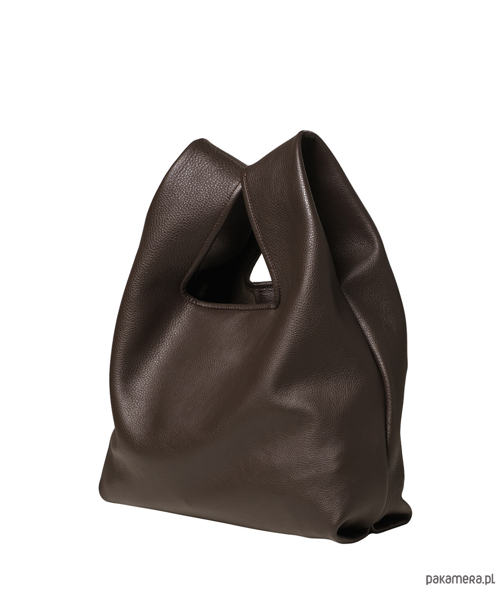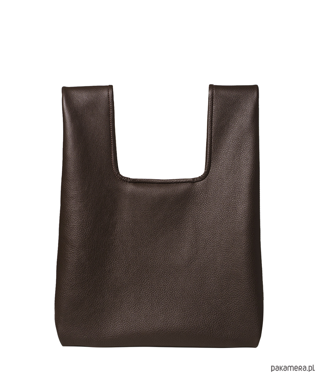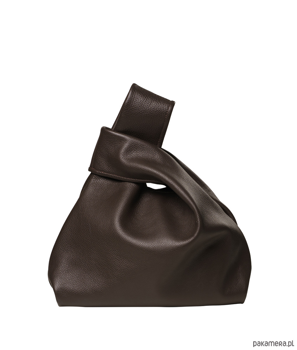 Torebka uszyta z miękkiej, mięsistej skóry w kolorze ciemno brązowym. Zapinana na magnesy, umiejscowione na wewnętrznych klapkach.