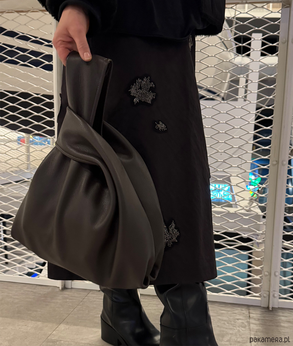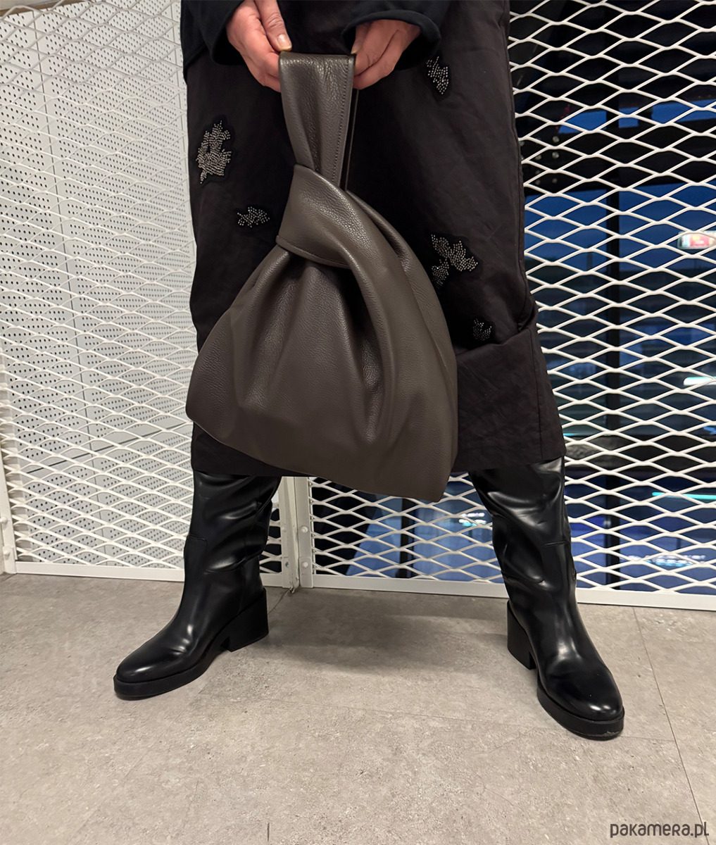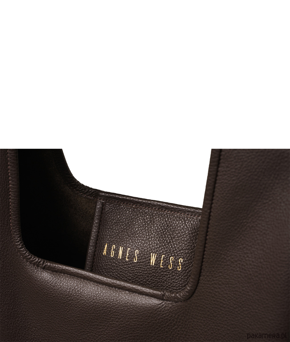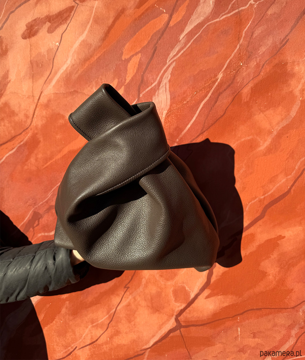 Torebka uszyta z miękkiej, mięsistej skóry w kolorze ciemno brązowym. Zapinana na magnesy, umiejscowione na wewnętrznych klapkach.