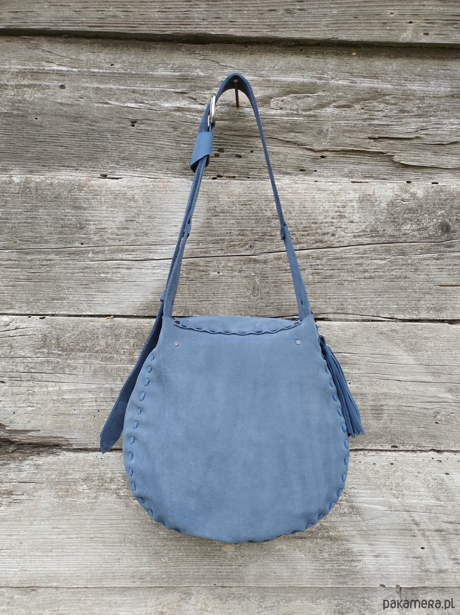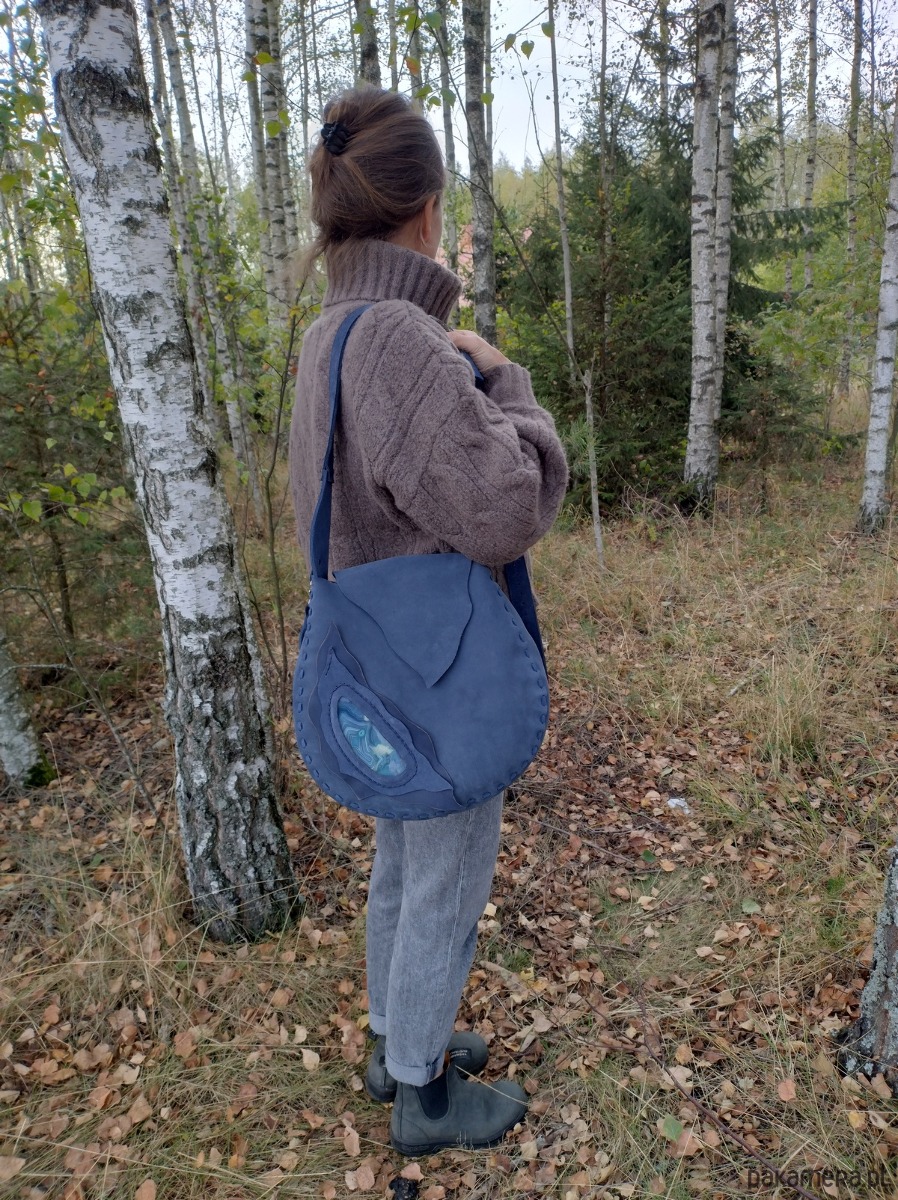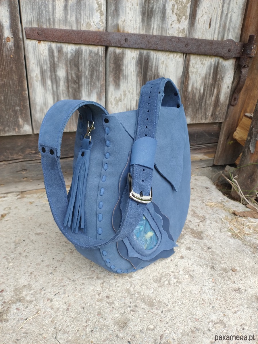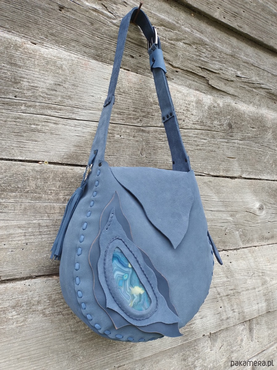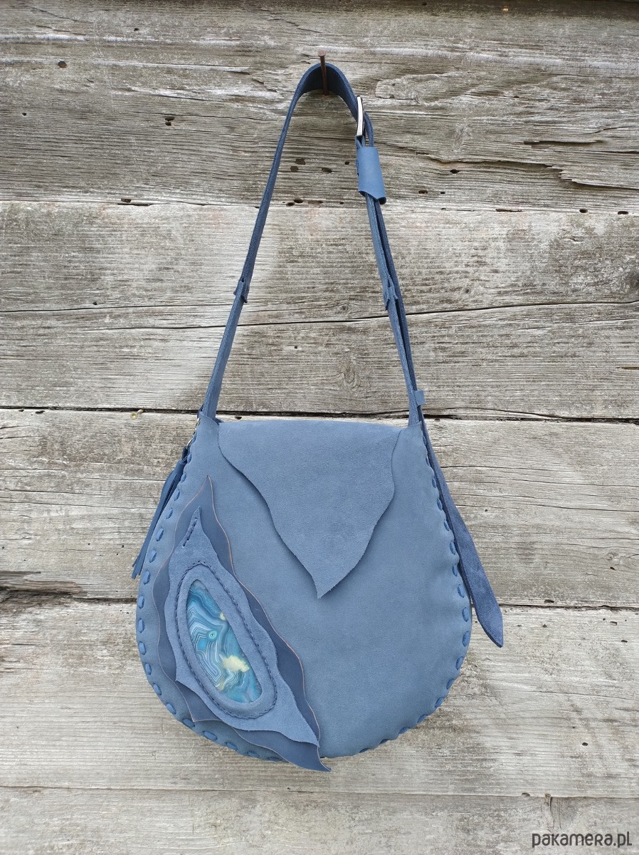 Torebka XL wykonana ręcznie z naturalnej , impregnowanej , nubukowej skóry w kolorze granatowo - grafitowym . Zszywana rzemieniem . Ozdobiona pieknym minerałem Agatem obszytym rzemieniem . Torebka zamykana na magnes .W środku kieszeń główna i kieszeń mniejsza zamykana na suwak . Torebka wykonana według autorskiego projektu . Pojedynczy egzemplarz . Posłuży długie lata a z wiekiem będzie jeszcze piękniejsza. Pakowna i wygodna.