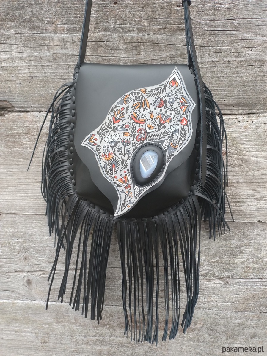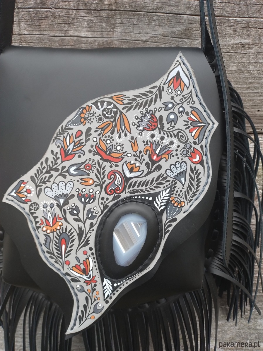 Torebka wykonana ręcznie z naturalnej impregnowanej skóry w kolorze czarnym . Torebka zszywana rzemieniem . Ozdobiona wypalonym i malowanym motywem etnicznych kwiatów, frędzlami oraz minerałem Agatem . Malowany wzór odporny na działanie czynników atmosferycznych . Torebka zamykana na magnes .W środku kieszeń główna i kieszeń mniejsza zamykana na suwak . Torebka wykonana według autorskiego projektu. Posłuży długie lata a z wiekiem będzie jeszcze piękniejsza.