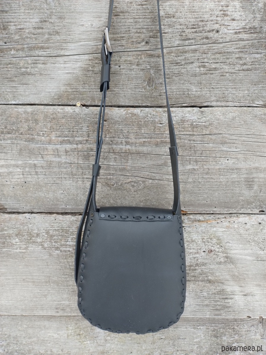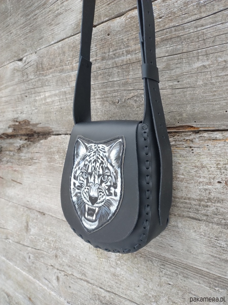 Torebka wykonana ręcznie z naturalnej, impregnowanej skóry w kolorze czarnym. Zszywana rzemieniem. Ozdobiona wypalonym i malowanym motywem pantery śnieżnej. Zamykana na magnes . Torebka wykonana według autorskiego projektu, pojedynczy egzemplarz.Torebka posłuży długie lata. Długość paska na ramię regulowana. Szerokość klamry 3 cm