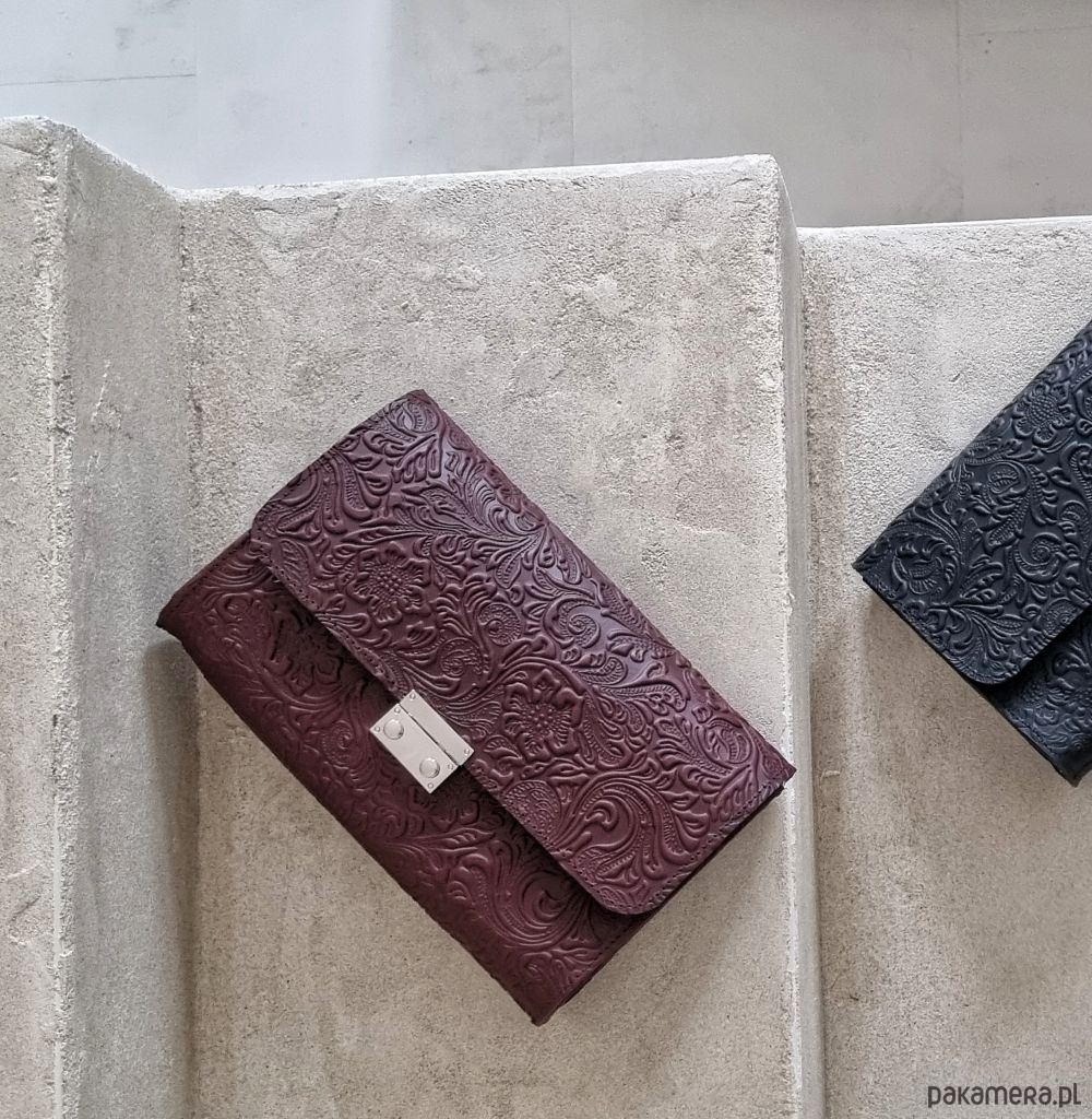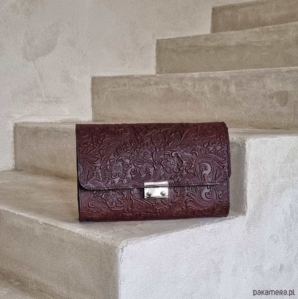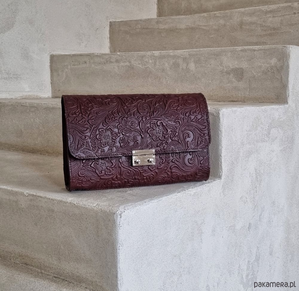 Torebka skórzana z łańcuszkiem CHESTNUT - tłoczony kwiatowy wzór