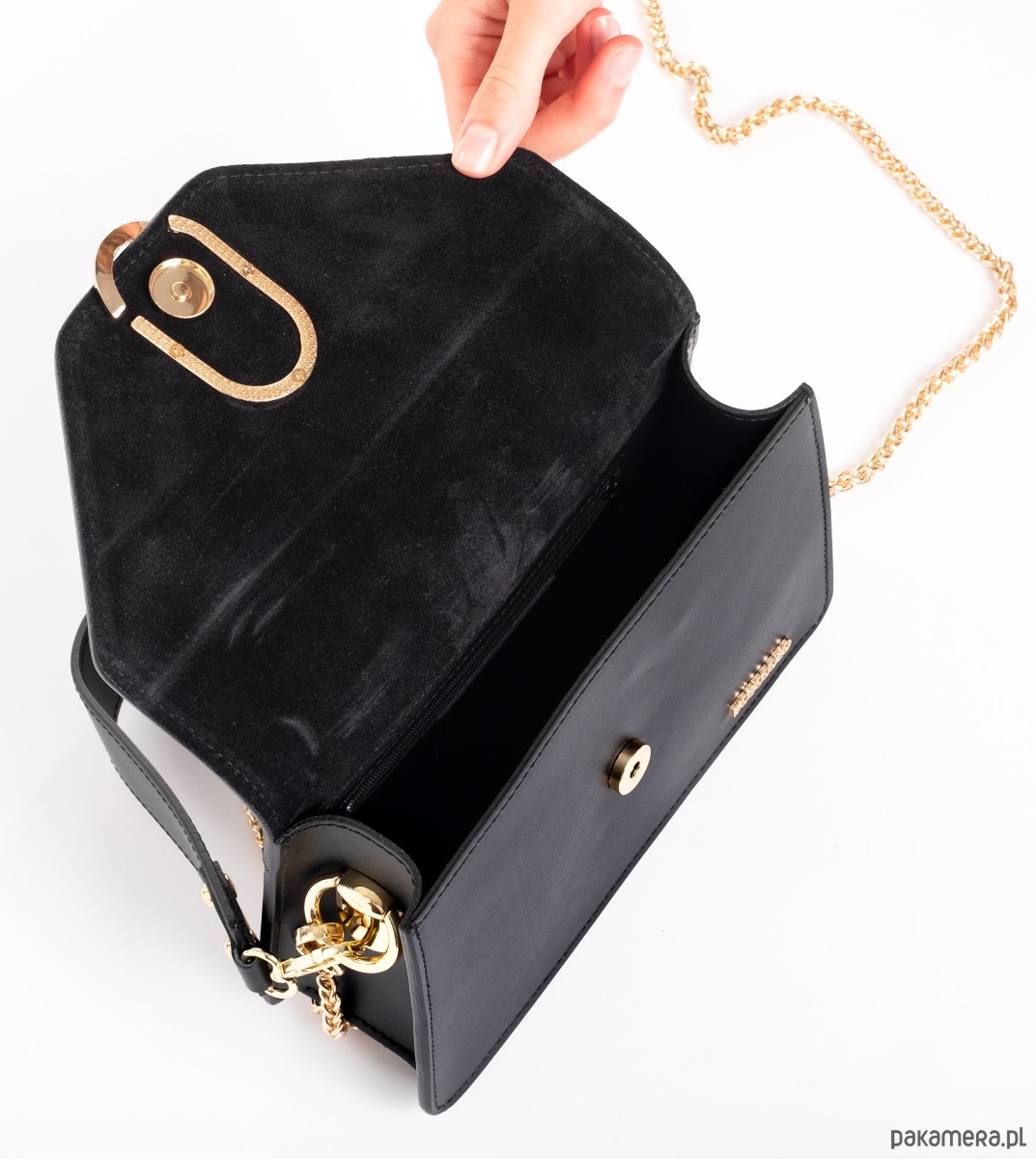 Ozdobne zamknięcie, dopinany łańcuszek do przewieszenia torebki przez ramię.