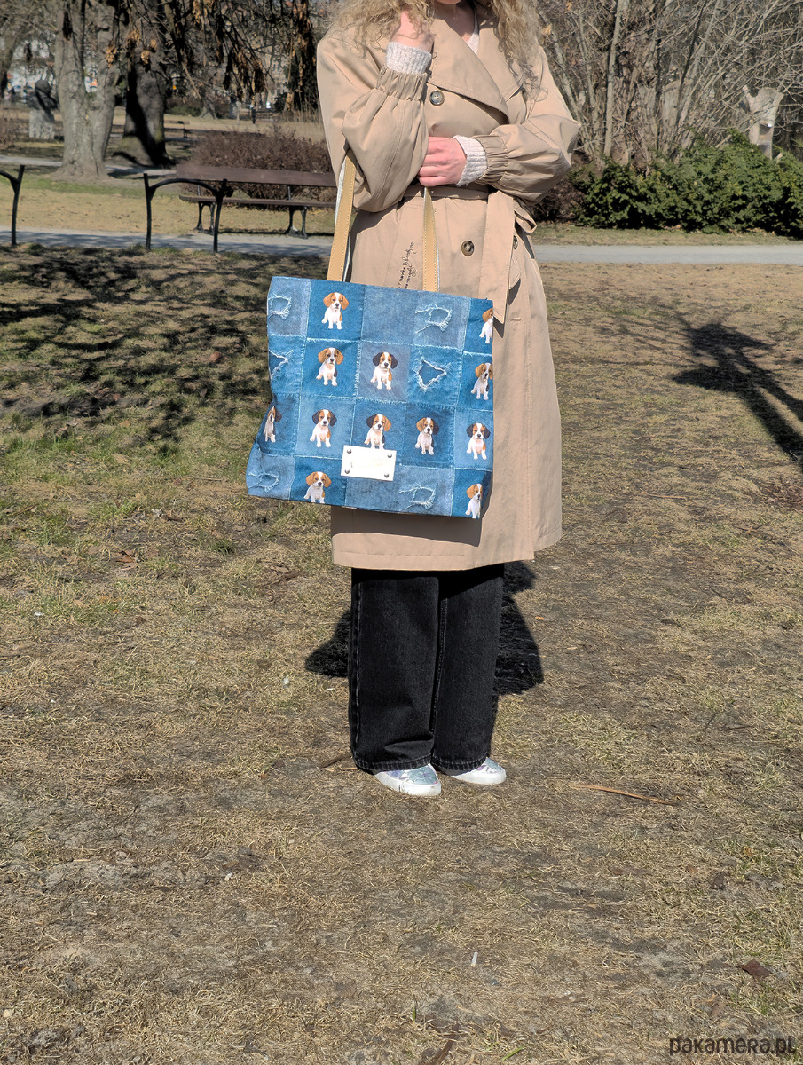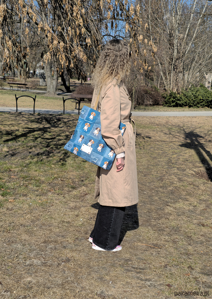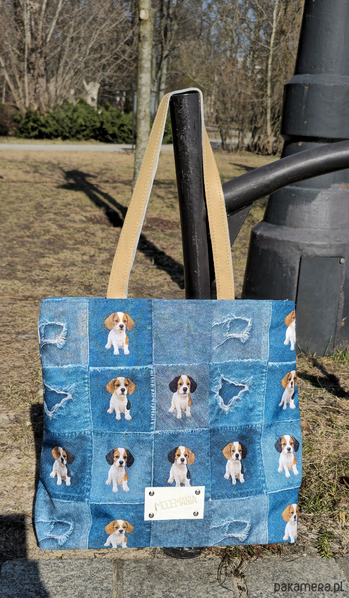 Wyrazista torba z denimowym printem i motywem beagle, beżowe uchwyty — pojemna, stylowa i idealna na co dzień!