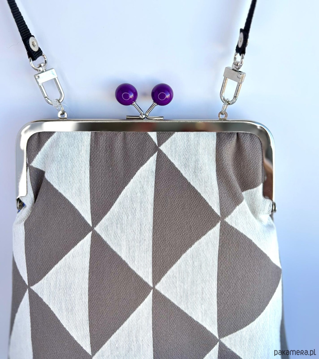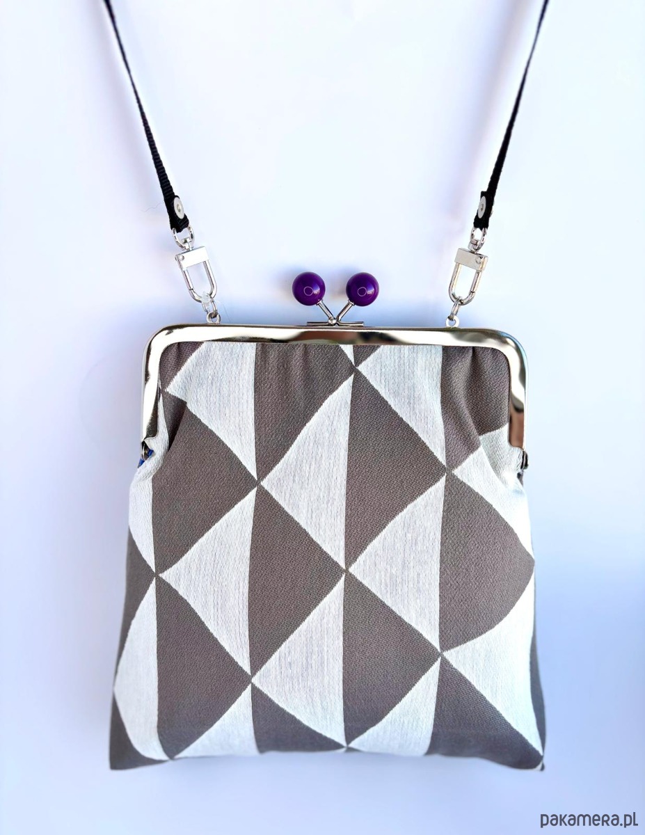 Mała, elegancka torebka marki twins ,zapinana na metalowe, srebrne zapięcie z kolorowymi fioletowymi kulkami. Wykonana z kolorowej, tkaniny. Wzór w biało-brązowe trójkąty. W środku podszewka , torebka jest wykonana z tkaniny obiciowej. Rączka to pasek do zakładania przez głowę .
