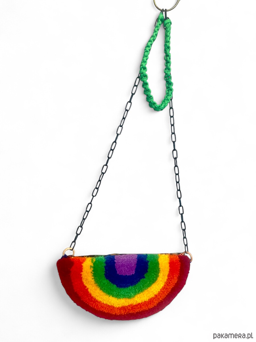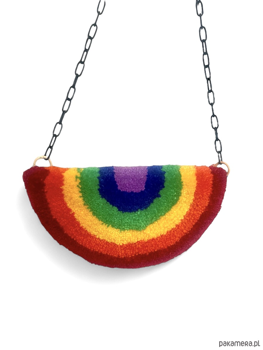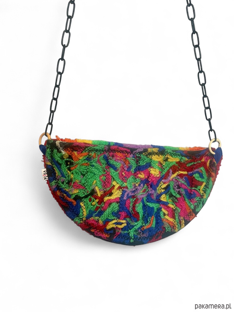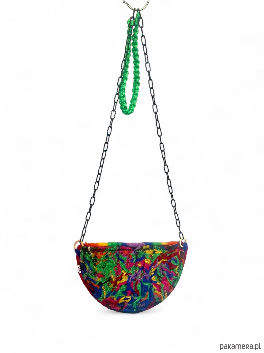 Z zewnątrz miękka, wyrazista i tekstylna – wykonana z włóczki akrylowej, z niepowtarzalnym wzorem. Druga strona wykończona pikowaną podszewką, uszytą ze ścinków włóczki powstałych podczas tworzenia oraz tiulu. Całość uzupełnia ręcznie pleciony, dopasowany kolorystycznie pasek.