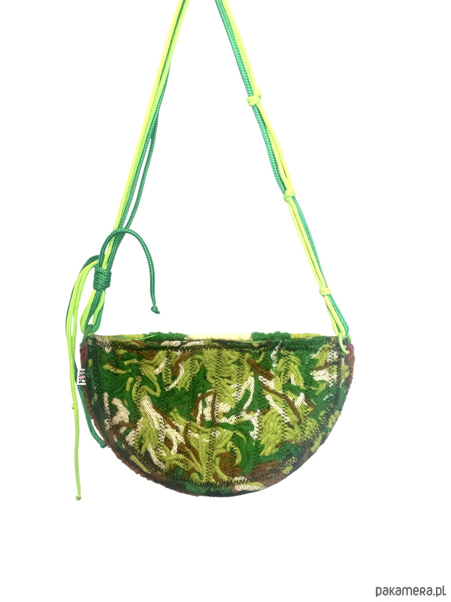 Z zewnątrz miękka, wyrazista i tekstylna – wykonana z włóczki akrylowej, z niepowtarzalnym wzorem. Druga strona wykończona pikowaną podszewką, uszytą ze ścinków włóczki powstałych podczas tworzenia oraz tiulu. Całość uzupełnia ręcznie pleciony, dopasowany kolorystycznie pasek.