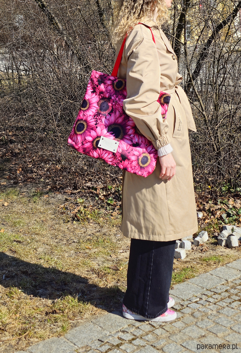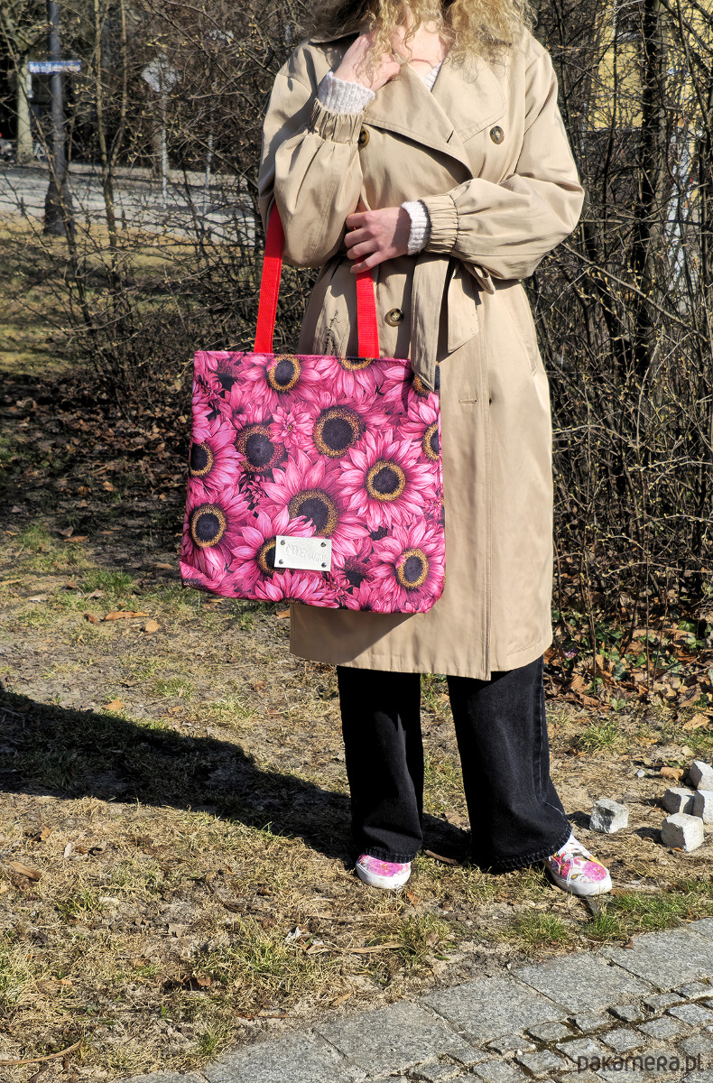 Wyrazista torba tote z motywem różowych słoneczników, czerwonymi uchwytami i skórzaną metką - pojemna, stylowa i idealna na co dzień.