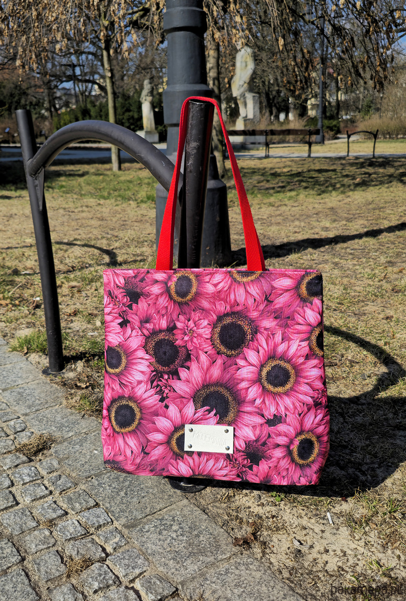 Wyrazista torba tote z motywem różowych słoneczników, czerwonymi uchwytami i skórzaną metką - pojemna, stylowa i idealna na co dzień.