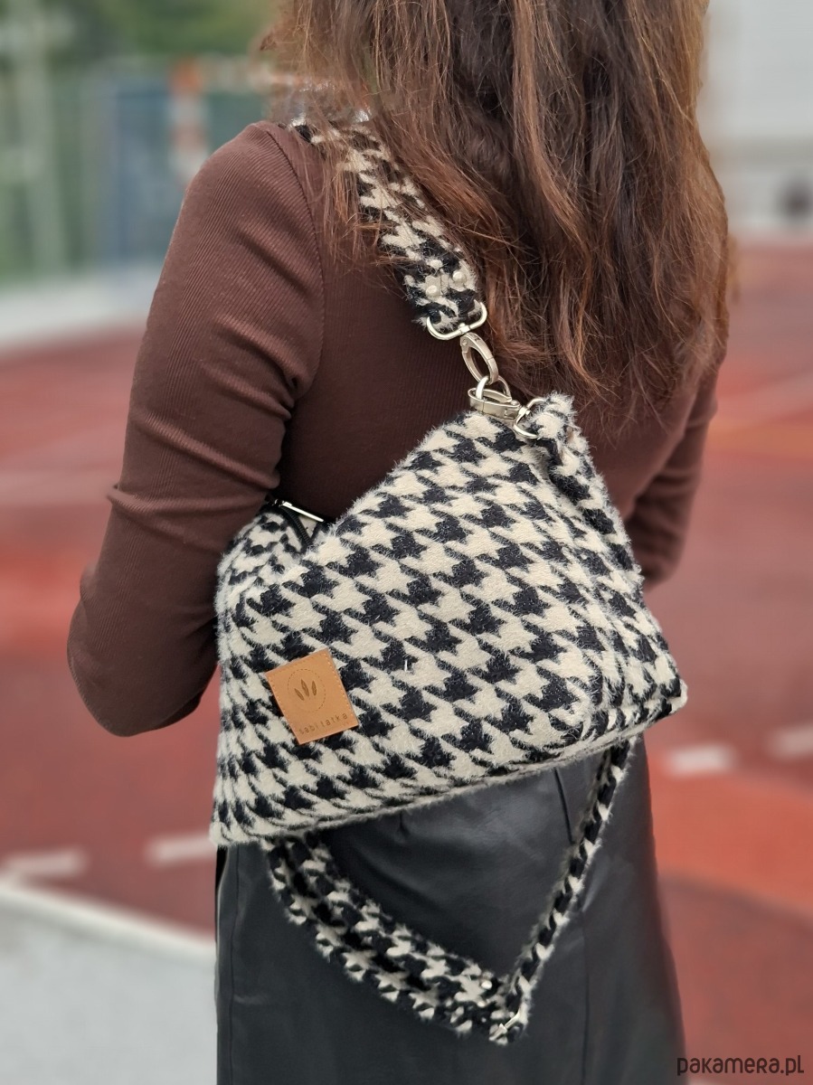 Torebka w pepitkę z puchatej tkaniny Beżowo-Czarna
