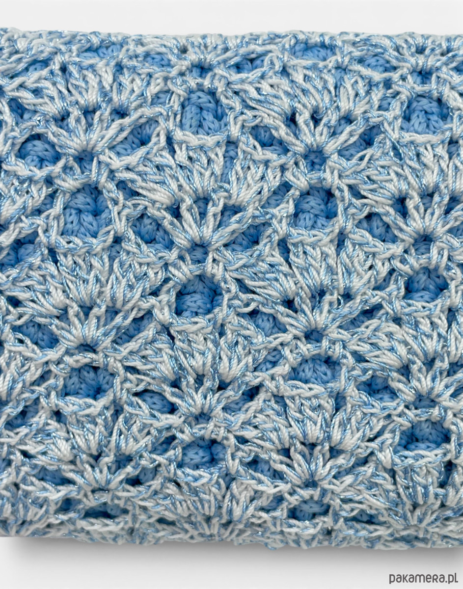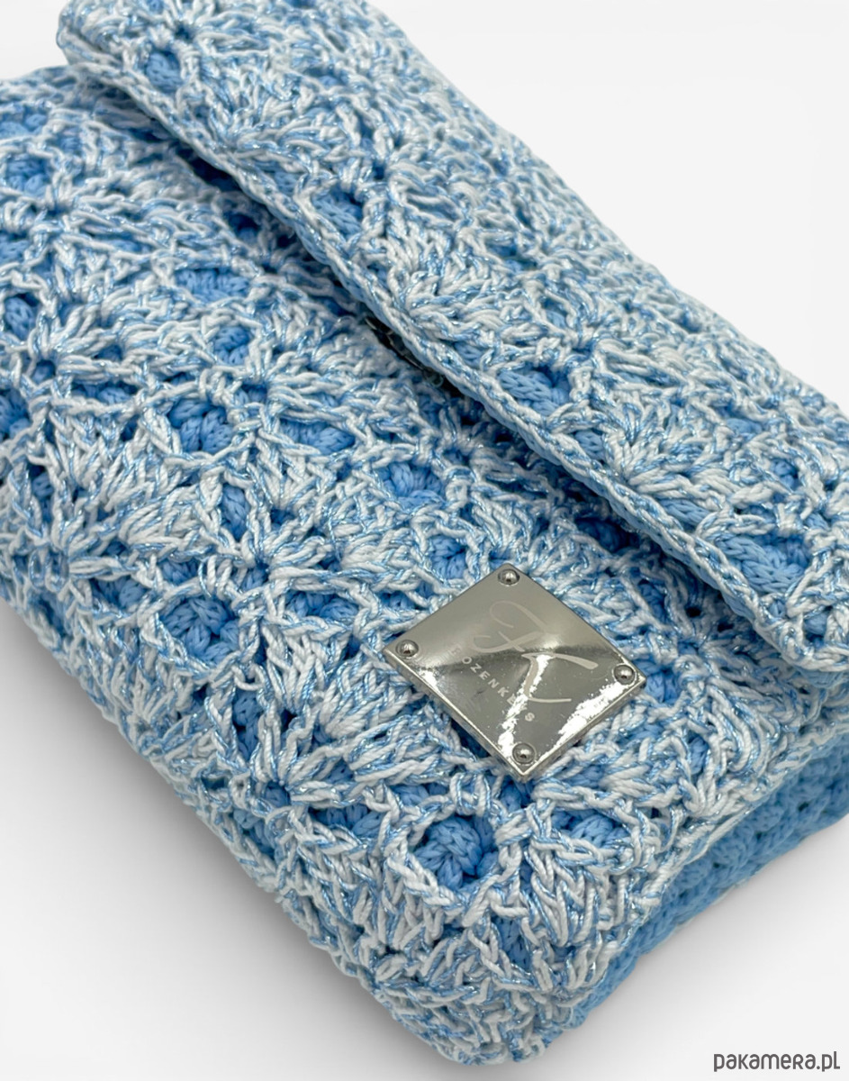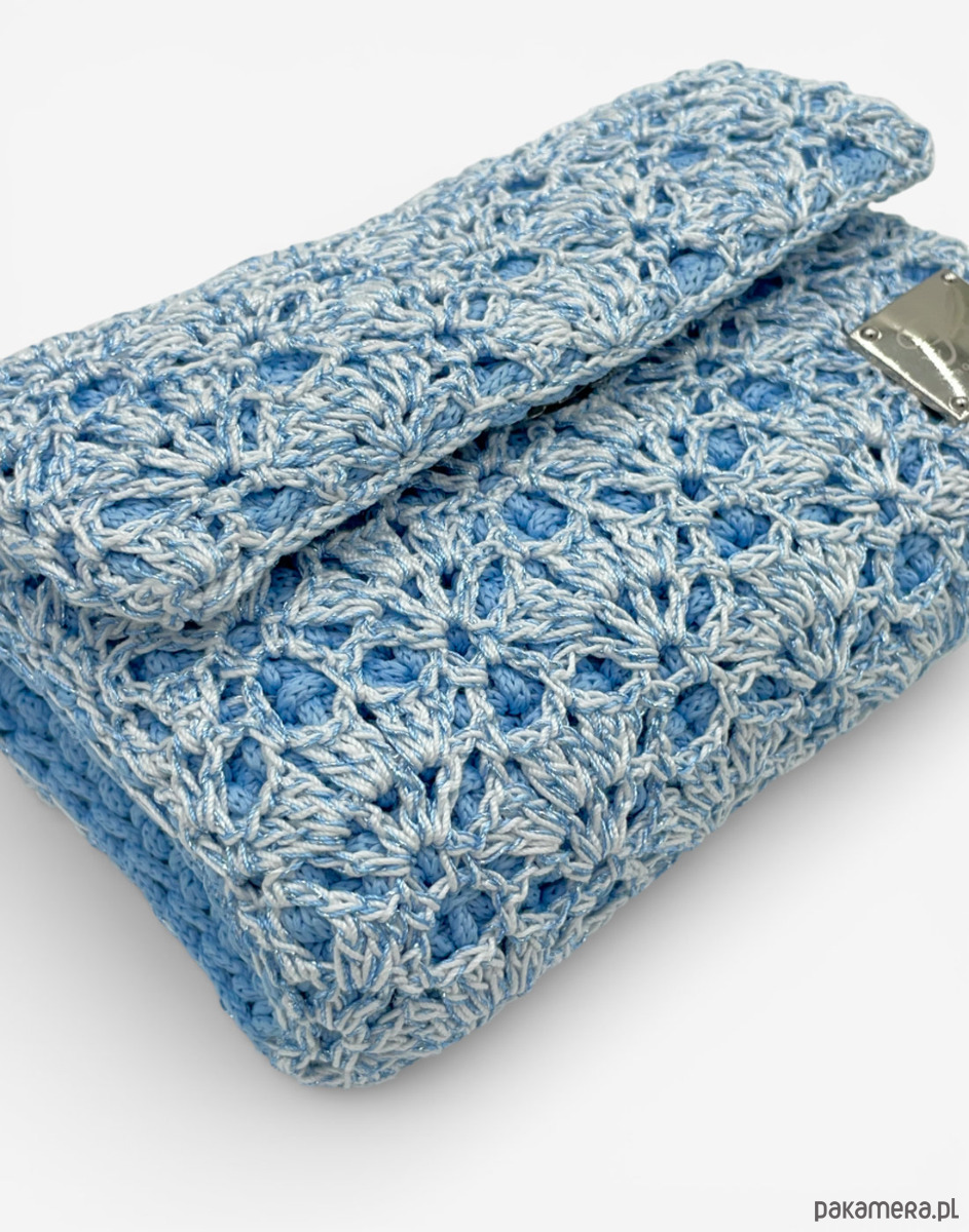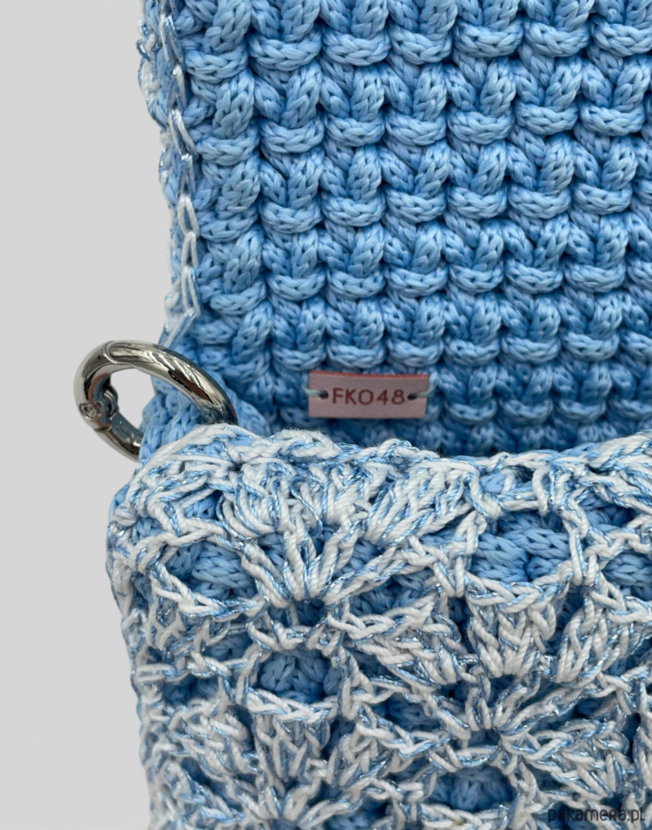 Torebka jest wykonana ze sznurka poliestrowego oraz kordonka bawełnianego wzbogaconego połyskującą nicią.