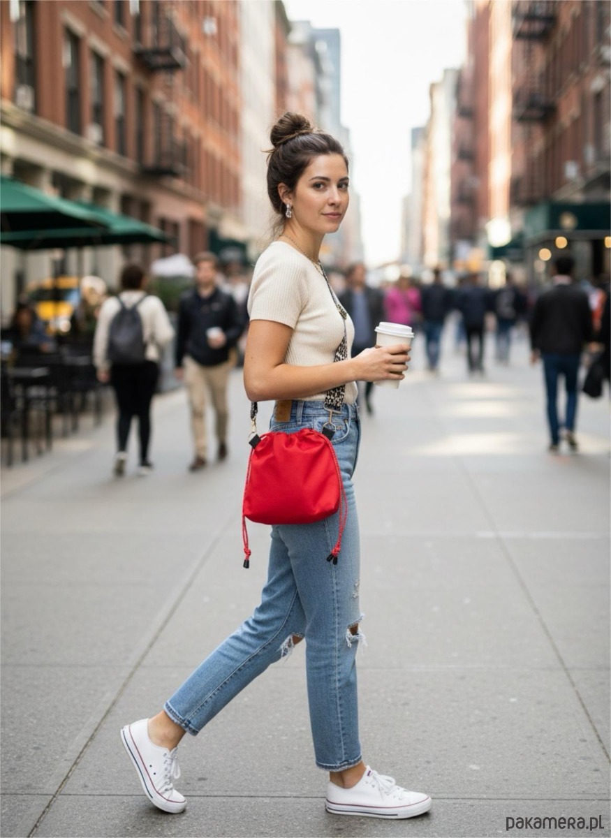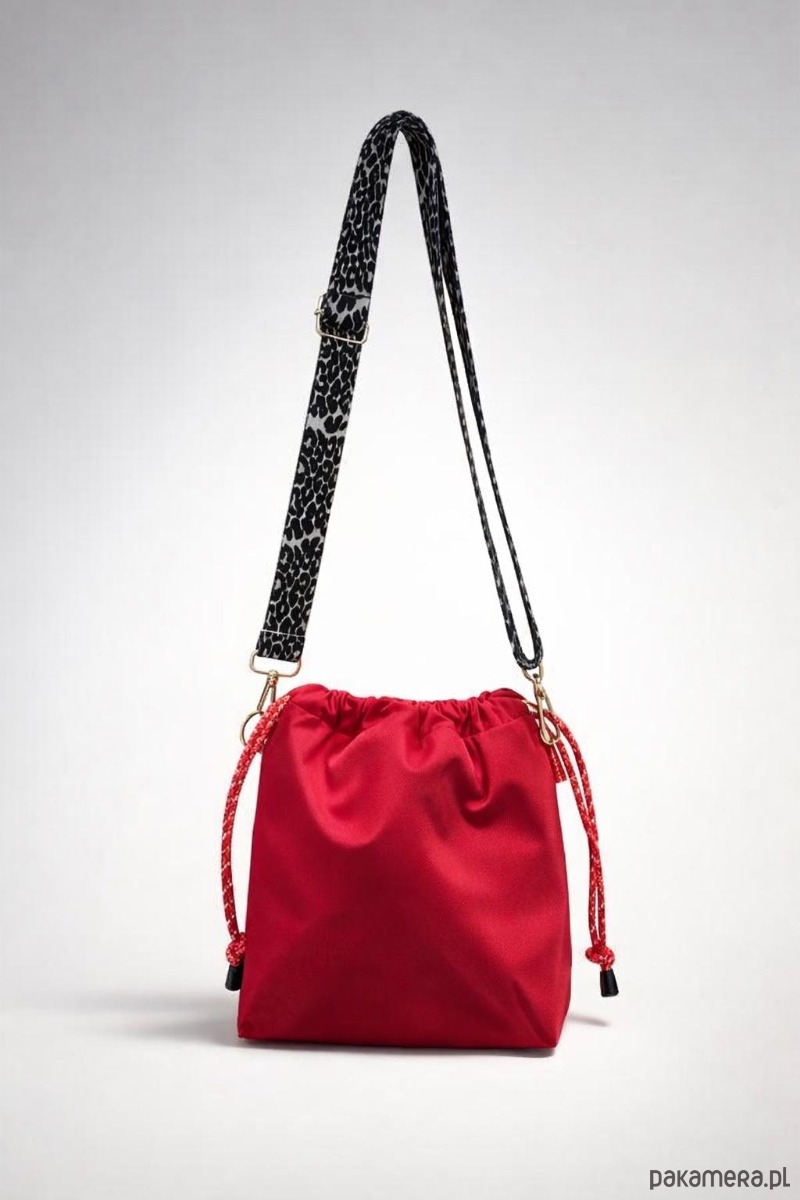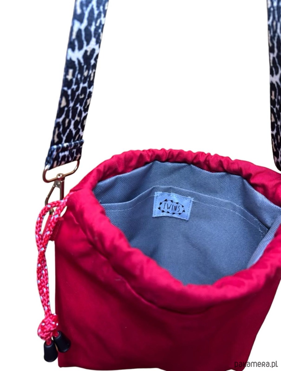 Mała sportowa, torebka Twins alternatywa dla wszechobecnej saszetki. Zaciągana na czerwony sznurek. Wykonany z czerwonej bawełnianej tkaniny . W środku podszewka , torebka jest wykonana z tkaniny obiciowej. Rączka to regulowany pasek z do zakładania przez głowę. Torebka jest usztywniana .