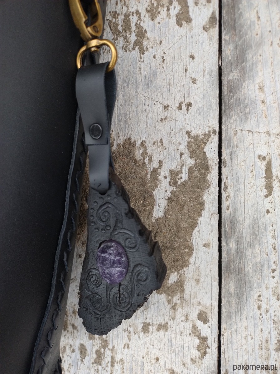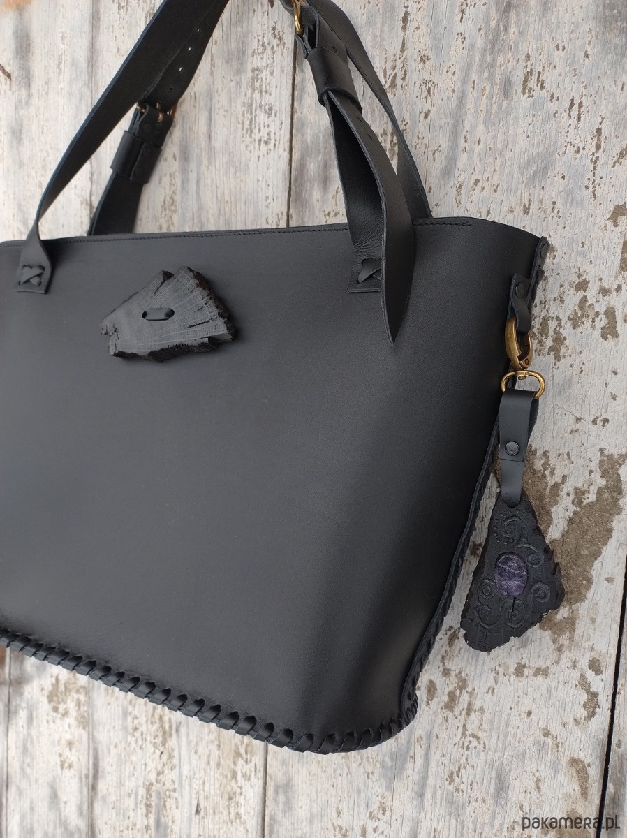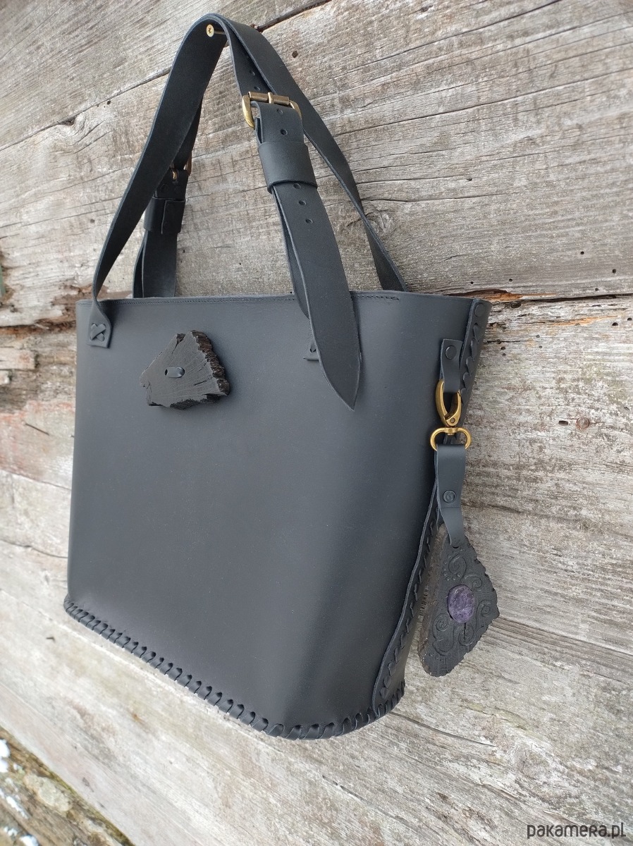 Torebka wykonana ręcznie z naturalnej , impregnowanej skóry w kolorze czarnym , matowym . Zszywana rzemieniem . Ozdobiona guzikiem wykonanym z drewna czarnego dębu oraz brelokiem w którym osadzony został minerał Ametyst . Torebka zamykana na suwak . W środku kieszeń główna oraz mniejsza kieszonka zamykana na suwak. torebka może być noszona na ramieniu oraz w ręku . Długość pasków regulowana , szerokośc klame 3 cm . Torebka wykonana według autorskiego projektu . Pojedynczy egzemplarz . Shopperka posłuży długie lata a z wiekiem będzie jeszcze piękniejsza .