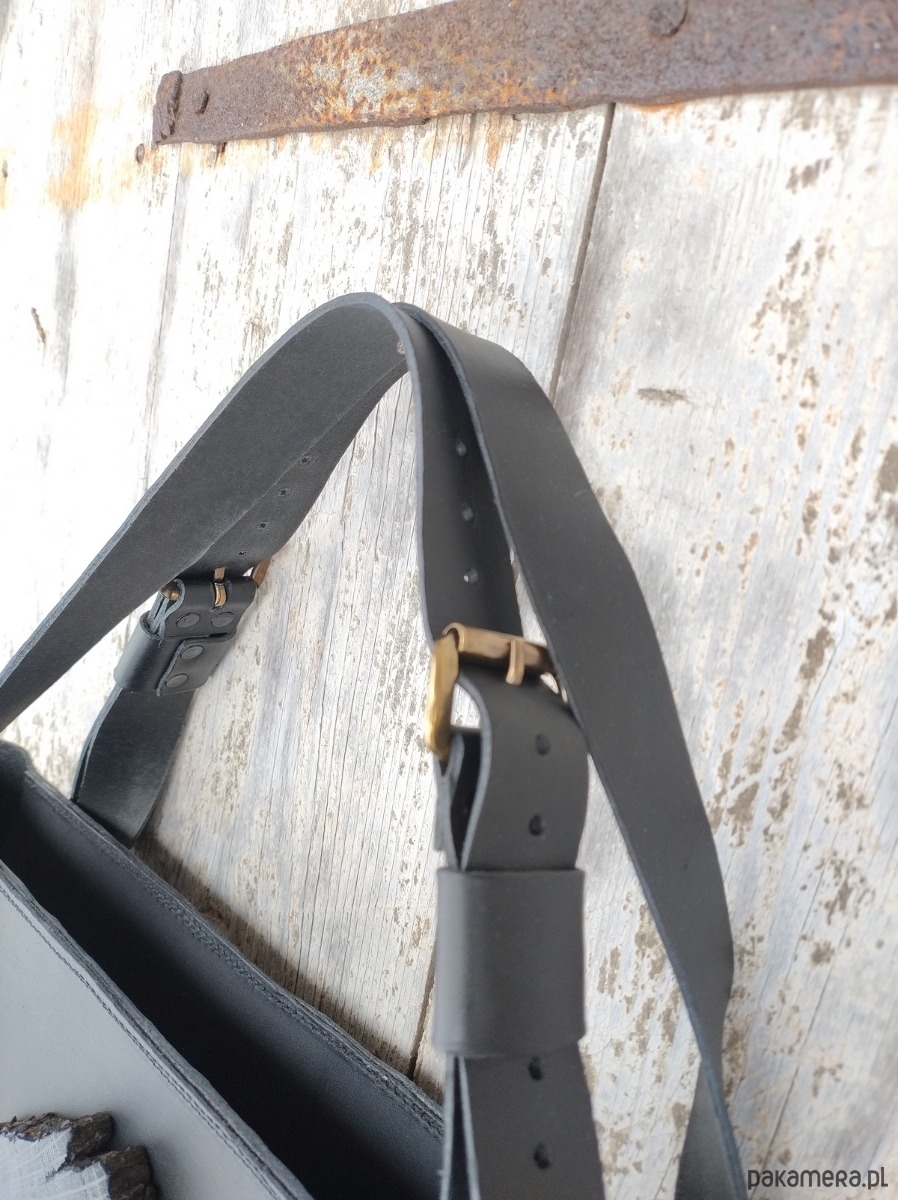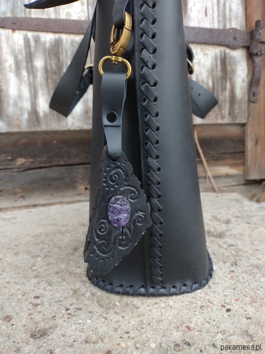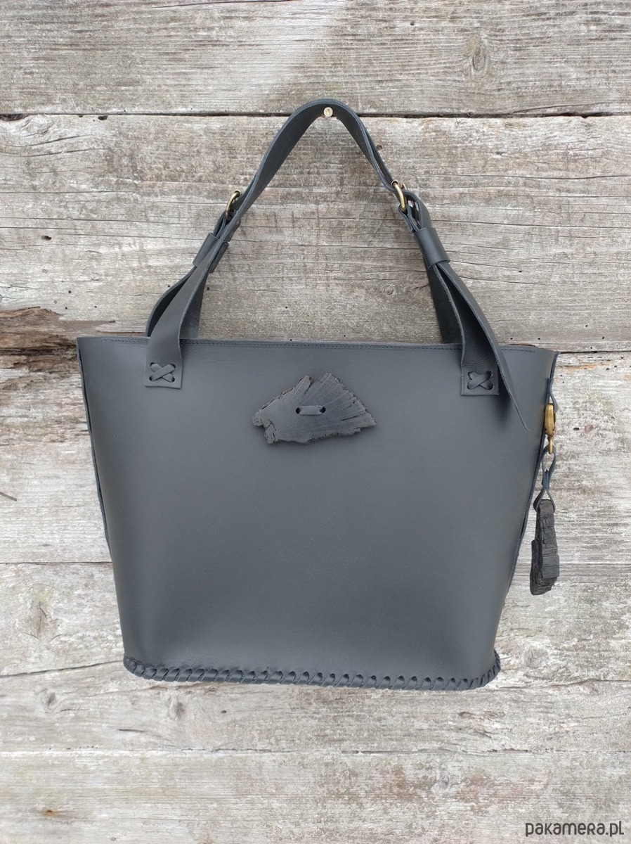 Torebka wykonana ręcznie z naturalnej , impregnowanej skóry w kolorze czarnym , matowym . Zszywana rzemieniem . Ozdobiona guzikiem wykonanym z drewna czarnego dębu oraz brelokiem w którym osadzony został minerał Ametyst . Torebka zamykana na suwak . W środku kieszeń główna oraz mniejsza kieszonka zamykana na suwak. torebka może być noszona na ramieniu oraz w ręku . Długość pasków regulowana , szerokośc klame 3 cm . Torebka wykonana według autorskiego projektu . Pojedynczy egzemplarz . Shopperka posłuży długie lata a z wiekiem będzie jeszcze piękniejsza .