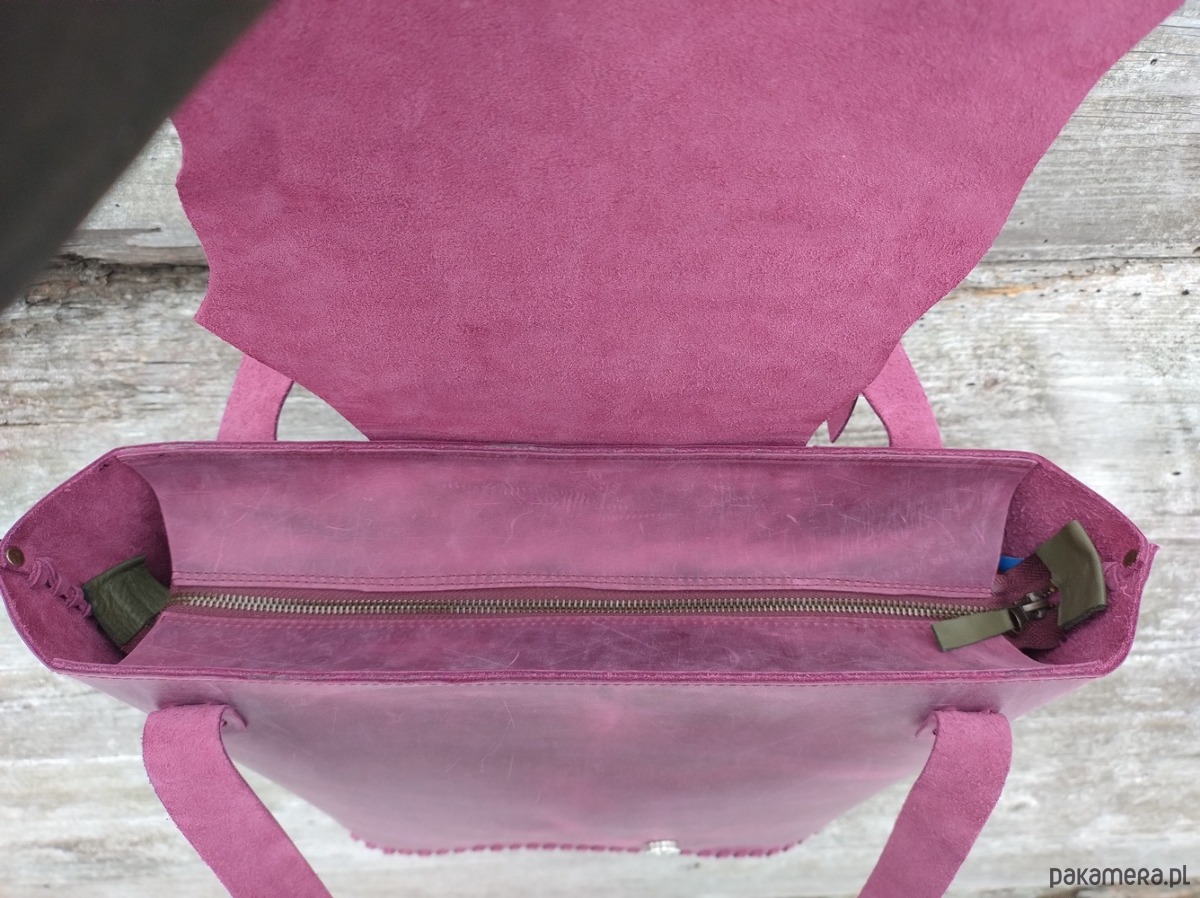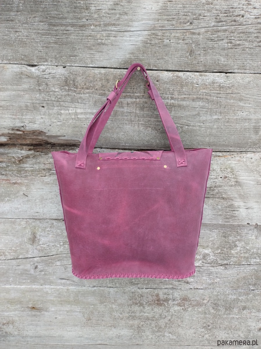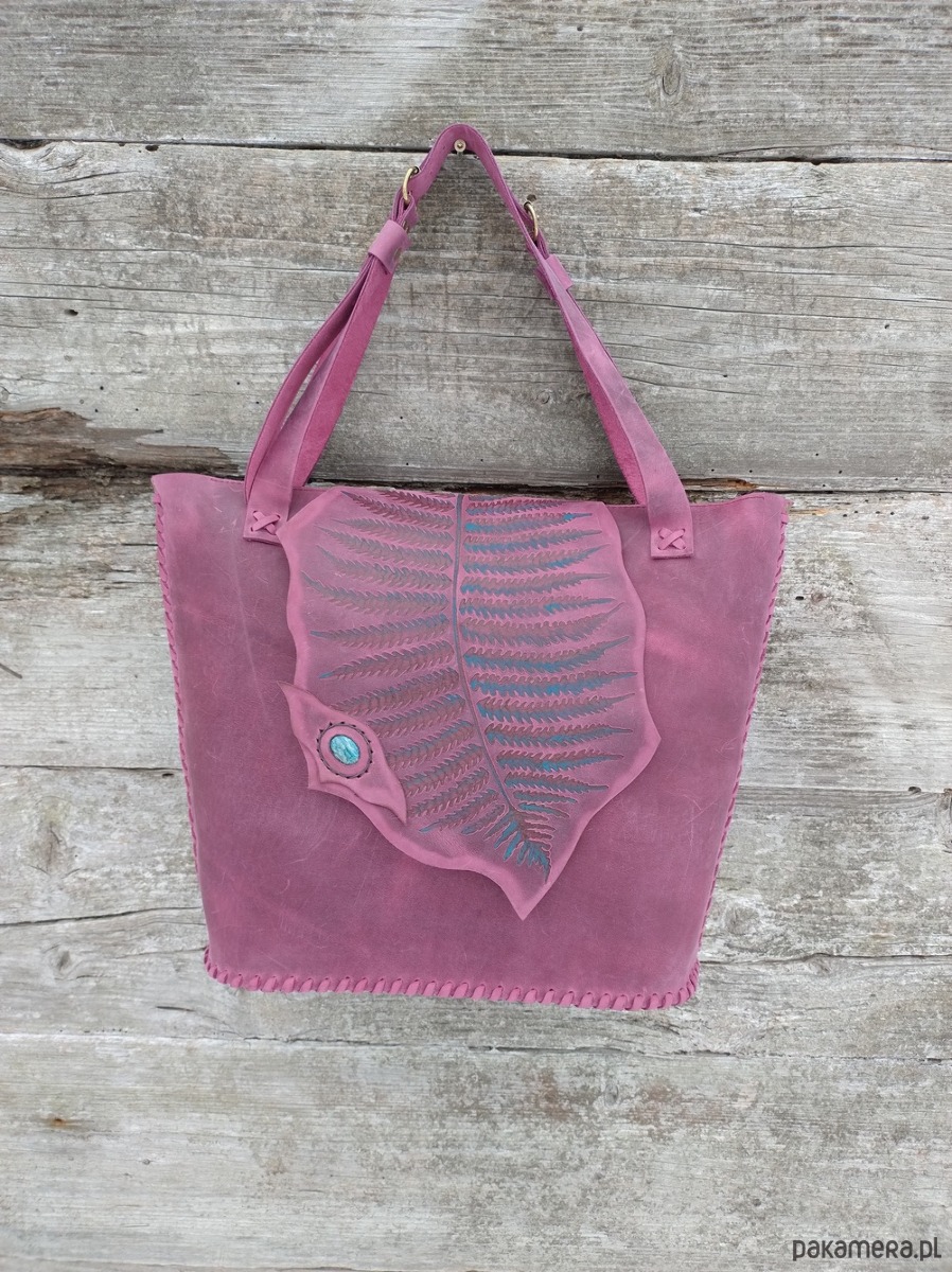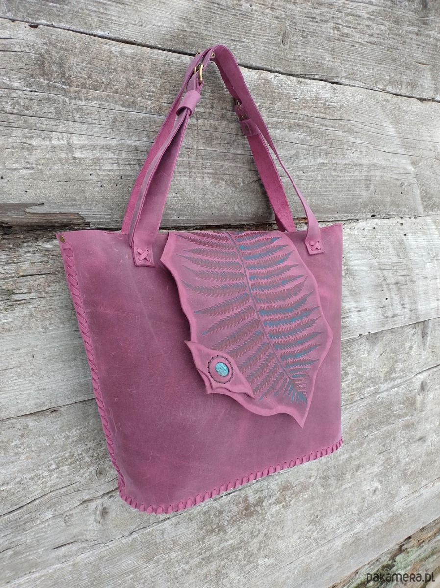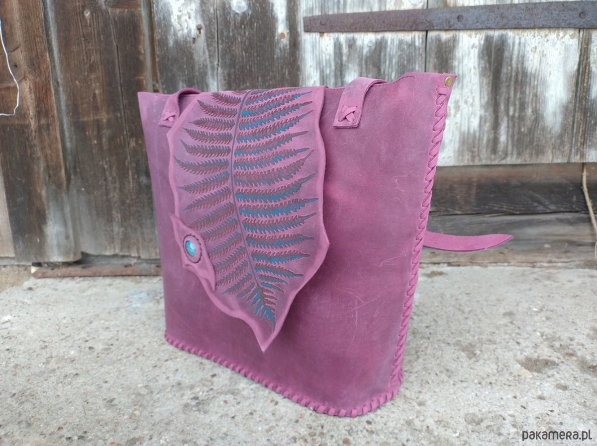 Torebka wykonana ręcznie z naturalnej, impregnowanej skóry w kolorze śliwkowo - bordowym . Ozdobiona wypalonym i malowanym motywem liścia paproci oraz minerałem Amazonitem .Zszywana rzemieniem . W środku kieszeń główna i kieszeń mniejsza zamykana na suwak . Torebka również zamykana na suwak. Długość pasków na ramię regulowana. Torebka uszyta według autorskiego projektu . Pojedynczy egzemplarz. Torebka posłuży długie lata. Skóra z której została uszyta jest świetnej jakości ,,crazy hors" , nie widać na niej plam ,pięknie się starzeje.