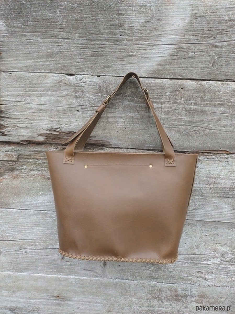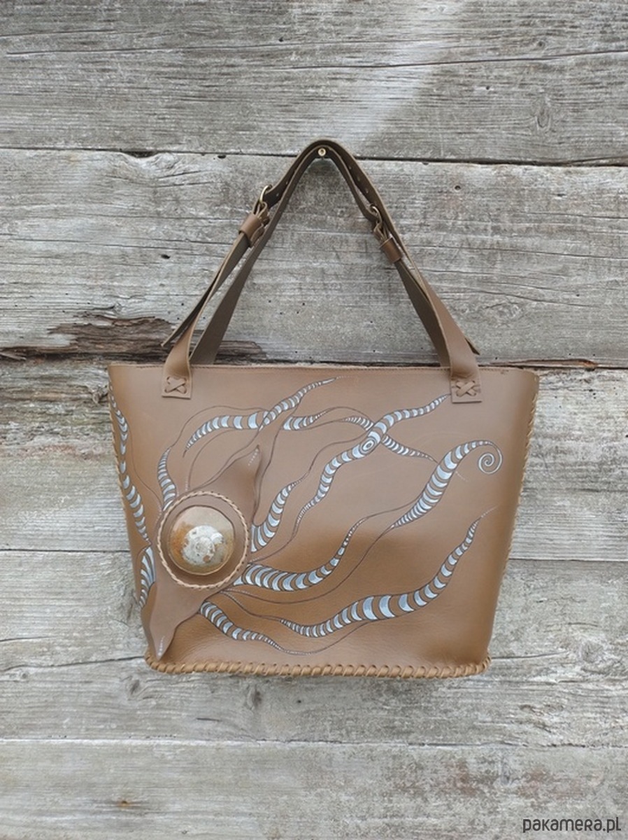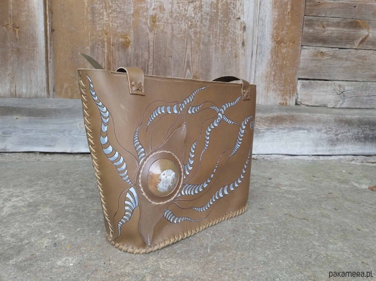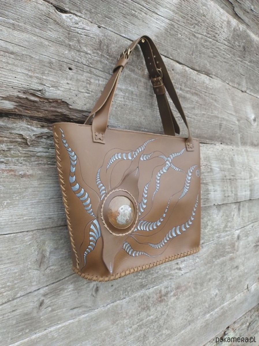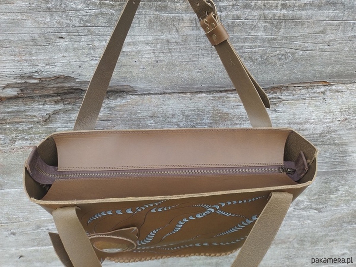 Torebka wykonana ręcznie z naturalnej , impregnowanej skóry w kolorze brązu wpadającego w zieleń oliwną . Zszywana rzemieniem . Torebka typu shopper , na ramię lub do ręki . Długość pasków regulowana . Ozdobiona pięknym minerałem Amonitem oraz wypalonym i malowanym motywem słóńca . Malowany wzór odporny na działanie czynników atmosferycznych . W środku kieszeń główna oraz mniejsza kieszonka zamykana na suwak . Torebka zamykana na suwak .Torebka wykonana według autorskiego projektu . Pojedynczy egzemplarz . Shopperka będzie służyć długie lata a z wiekiem będzie jeszcze piękniejsza .
