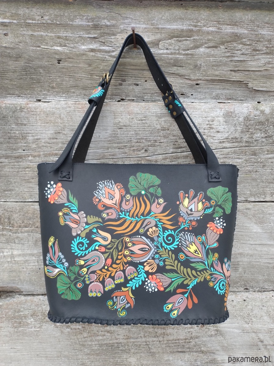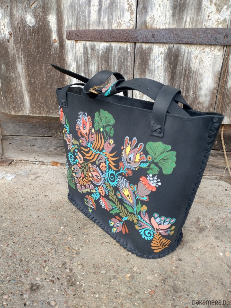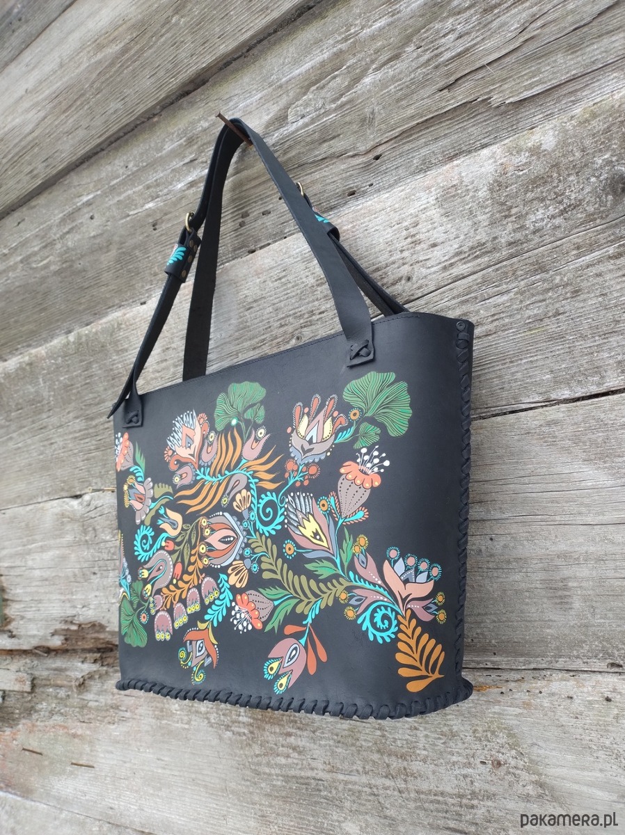 Torebka wykonana ręcznie z naturalnej , impregnowanej skóry w kolorze czarnym matowym . Zszywana rzemieniem . Torebka typu shopper , na ramię lub do ręki . Długość pasków regulowana . Ozdobiona malowanym motywem kwiatów . Malowany wzór odporny na działanie czynników atmosferycznych . W środku kieszeń główna oraz mniejsza kieszonka zamykana na suwak . Torebka zamykana na suwak .Torebka wykonana według autorskiego projektu . Pojedynczy egzemplarz . Shopperka będzie służyć długie lata a z wiekiem będzie jeszcze piękniejsza .