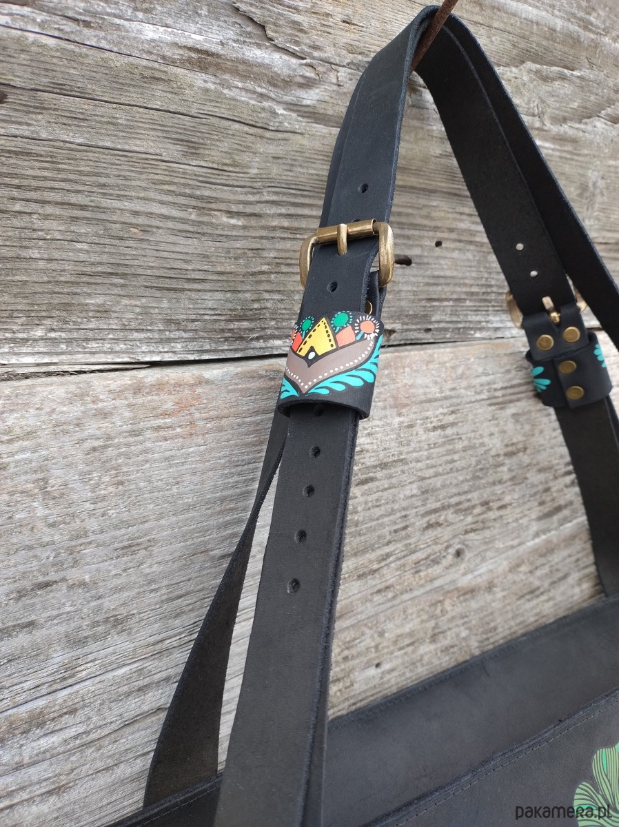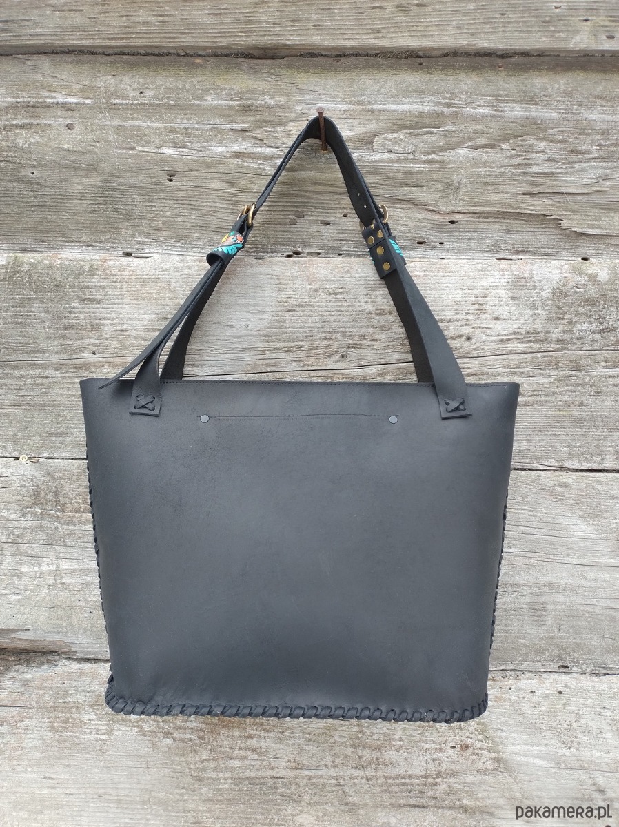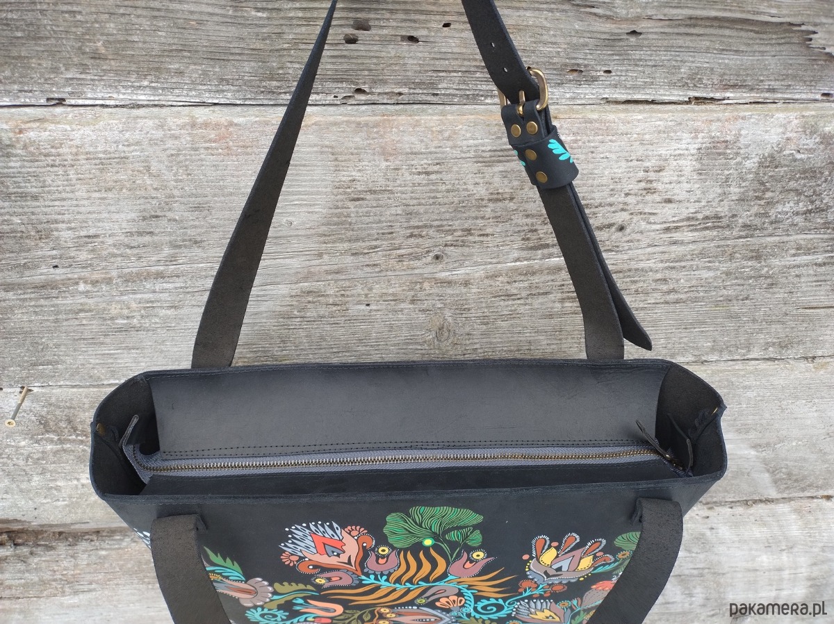 Torebka wykonana ręcznie z naturalnej , impregnowanej skóry w kolorze czarnym matowym . Zszywana rzemieniem . Torebka typu shopper , na ramię lub do ręki . Długość pasków regulowana . Ozdobiona malowanym motywem kwiatów . Malowany wzór odporny na działanie czynników atmosferycznych . W środku kieszeń główna oraz mniejsza kieszonka zamykana na suwak . Torebka zamykana na suwak .Torebka wykonana według autorskiego projektu . Pojedynczy egzemplarz . Shopperka będzie służyć długie lata a z wiekiem będzie jeszcze piękniejsza .
