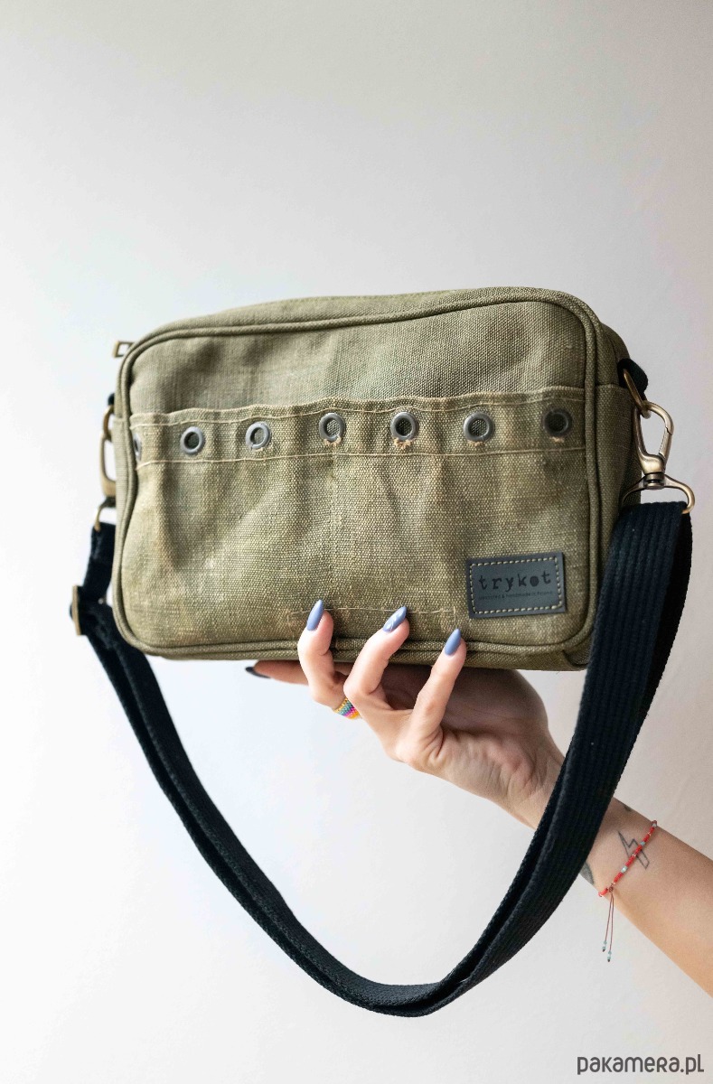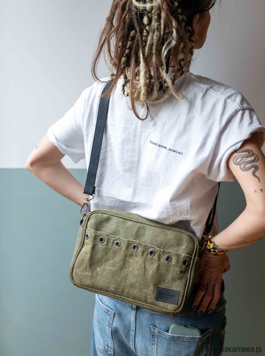 Brezent wojskowy to bardzo wytrzymała tkanina o właściwościach wodoszczelnych. W środku torby kolorowa podszewka i praktyczna kieszonka na suwak, całość zapinana na suwak. Metalowe suwaki i okucia - produkt bez plastiku i skóry. Dodatkowo torba posiada długi, regulowany pasek z taśmy bawełnianej.