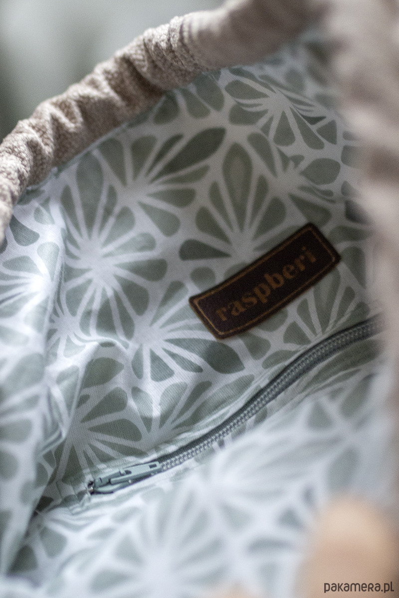Ściągana jest jak worek bawełnianym sznurkiem w kolorze zielonym. Dół daje dodatkowe miejsce na przechowywanie rzeczy - z przodu dwie mniejsze, z tyłu torby jedna duża kieszeń.