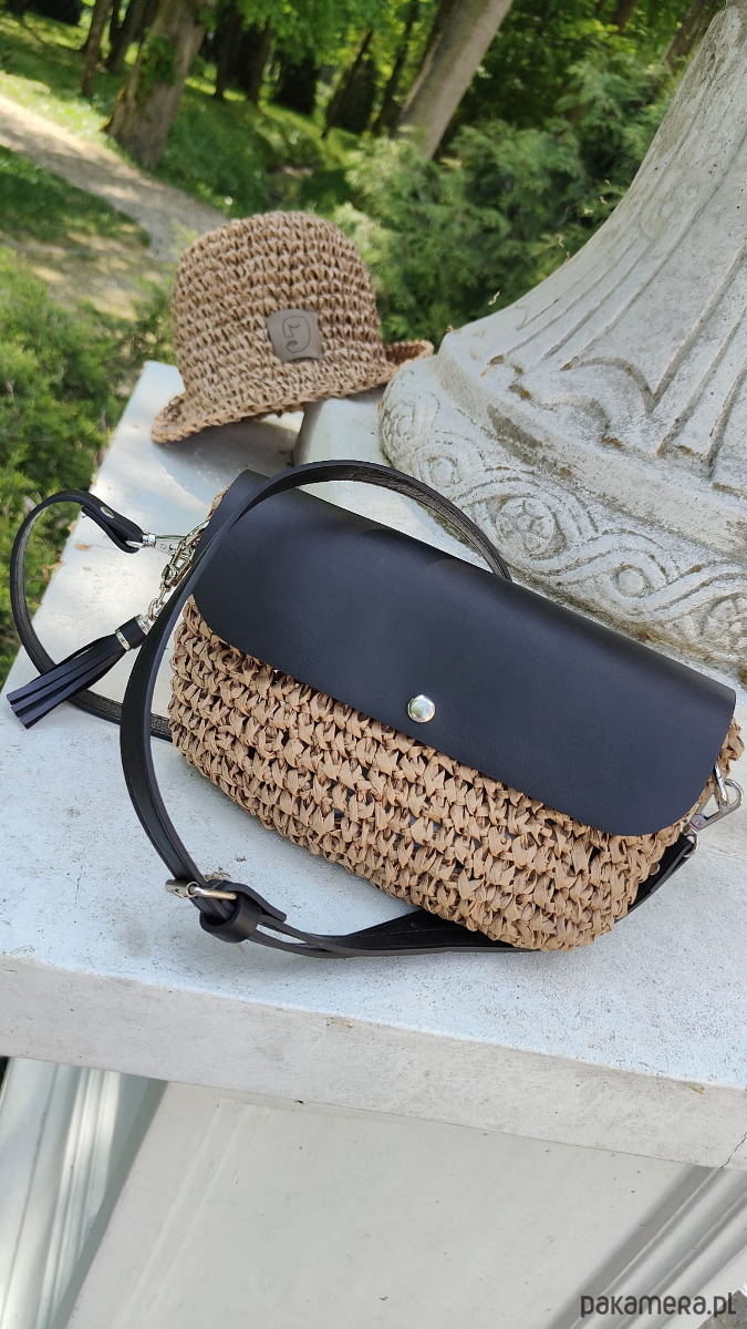 Kolor: naturalny (słomkowy) z czarną, skórzaną klapką i regulowanym paskiem