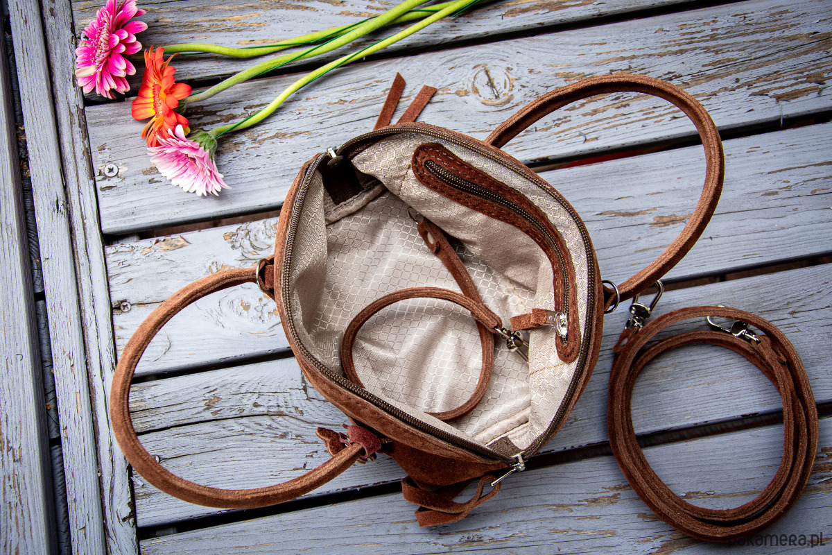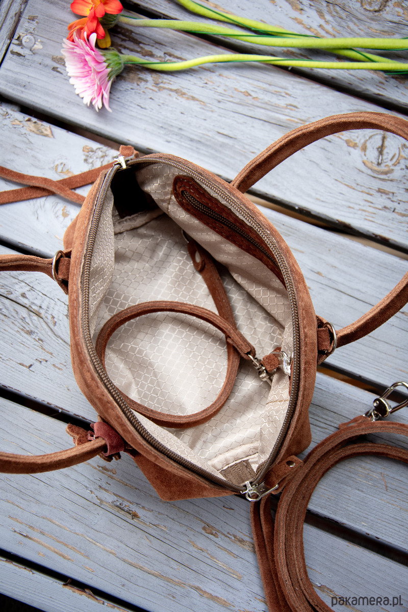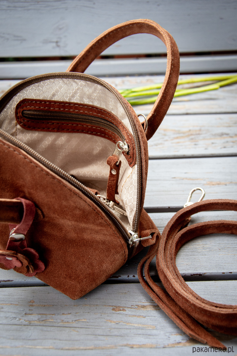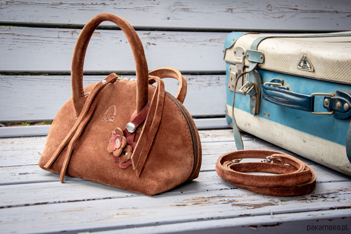 Mała, pękata torebka z naturalnej zamszowej skóry, wykonana ręcznie z dbałością o każdy detal.