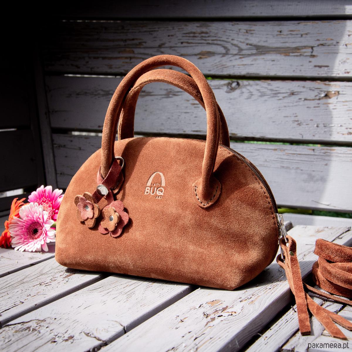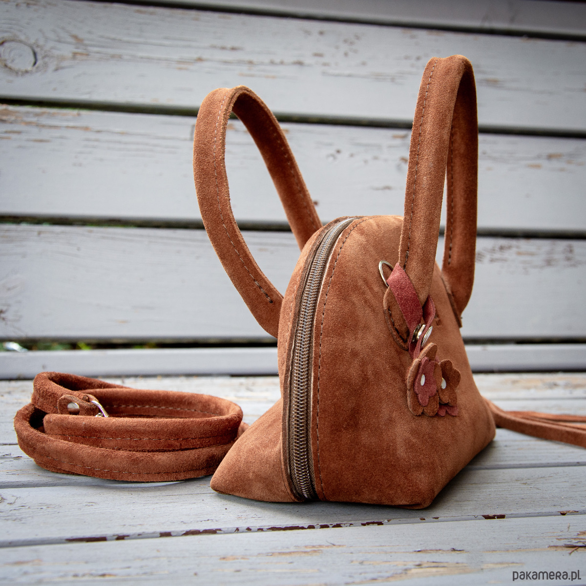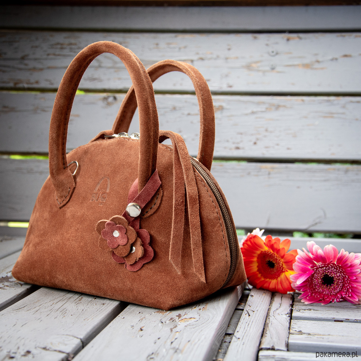 Mała, pękata torebka z naturalnej zamszowej skóry, wykonana ręcznie z dbałością o każdy detal.