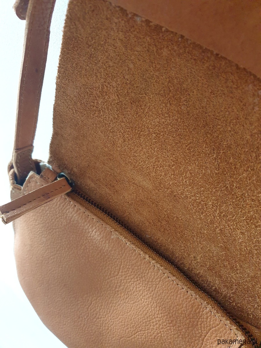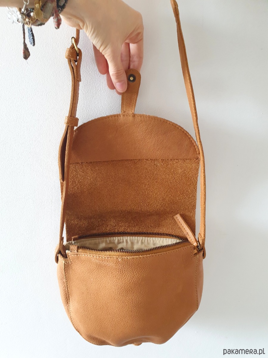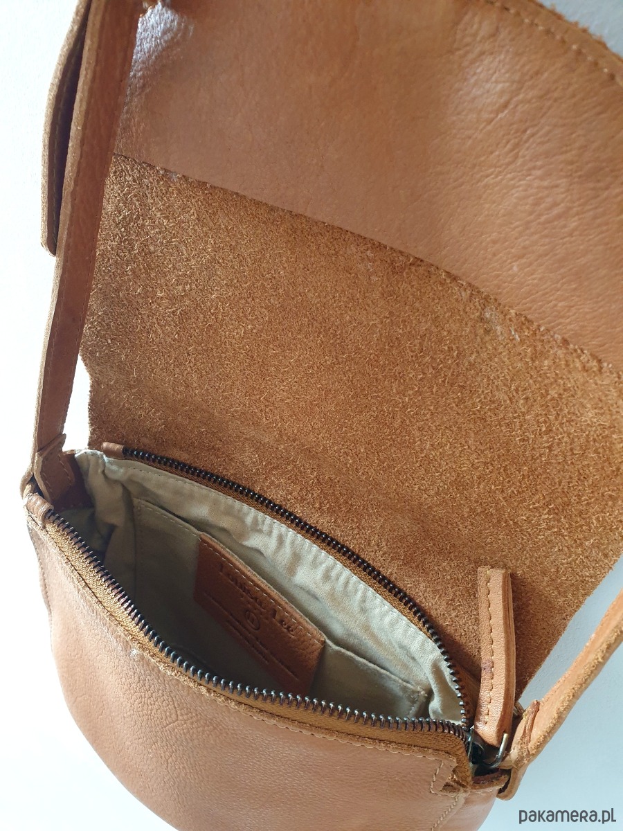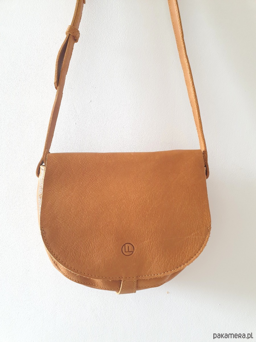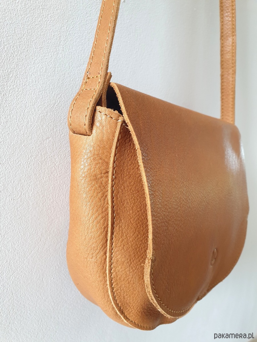 Torebka wykonana z miękkiej pranej naturalnej skóry bydlęcej w kolorze camel (miodowy żółty brąz), oraz bawełnianej podszewki. Torebka ma skórzany regulowany pasek można zakładać na ramię albo przez ramię. Torebka ma klapkę zapinaną na zatrzask, oraz w środku dodatkowe zapięcie na zamek. W środku w głównej komorze jest kieszonka.