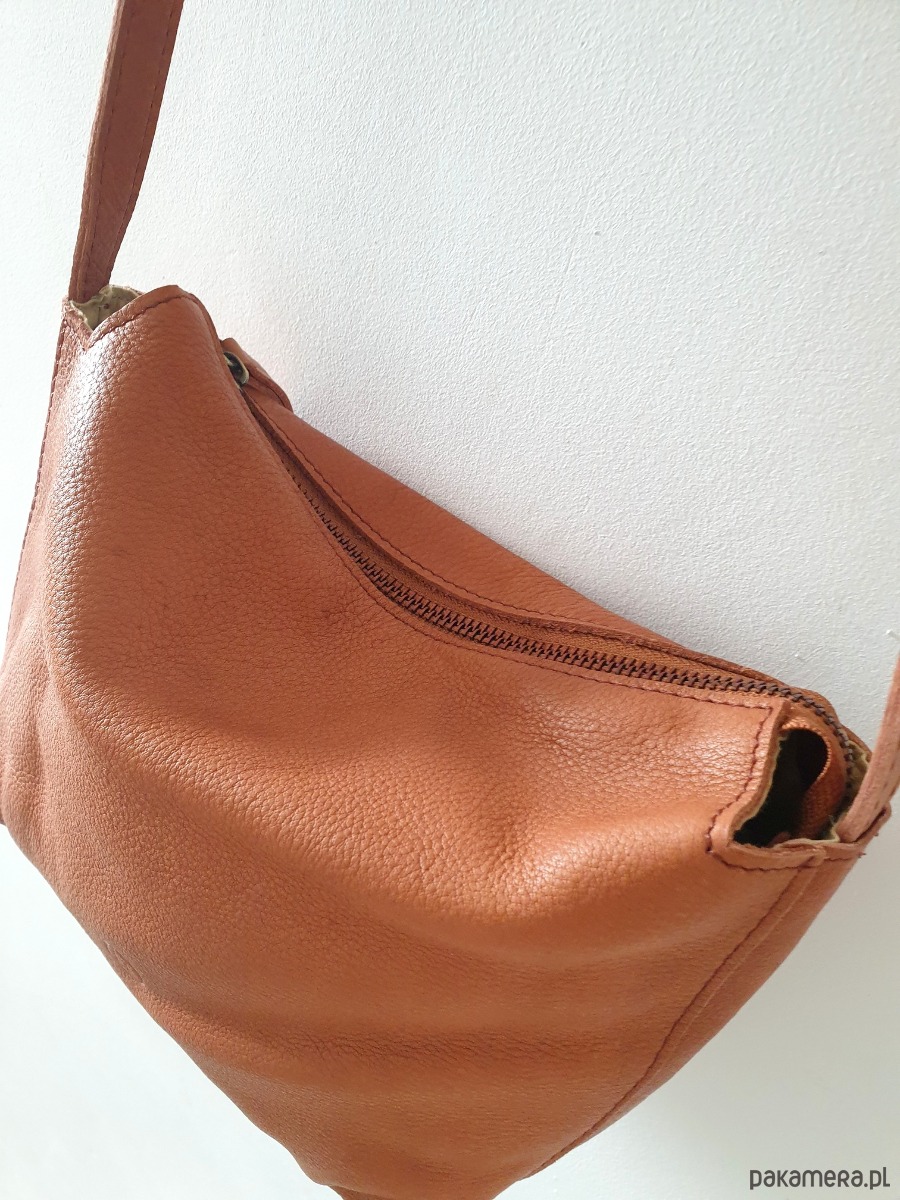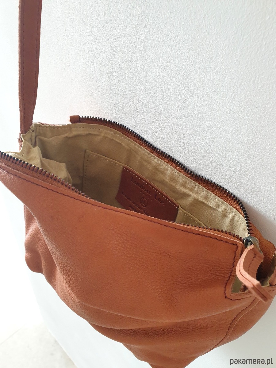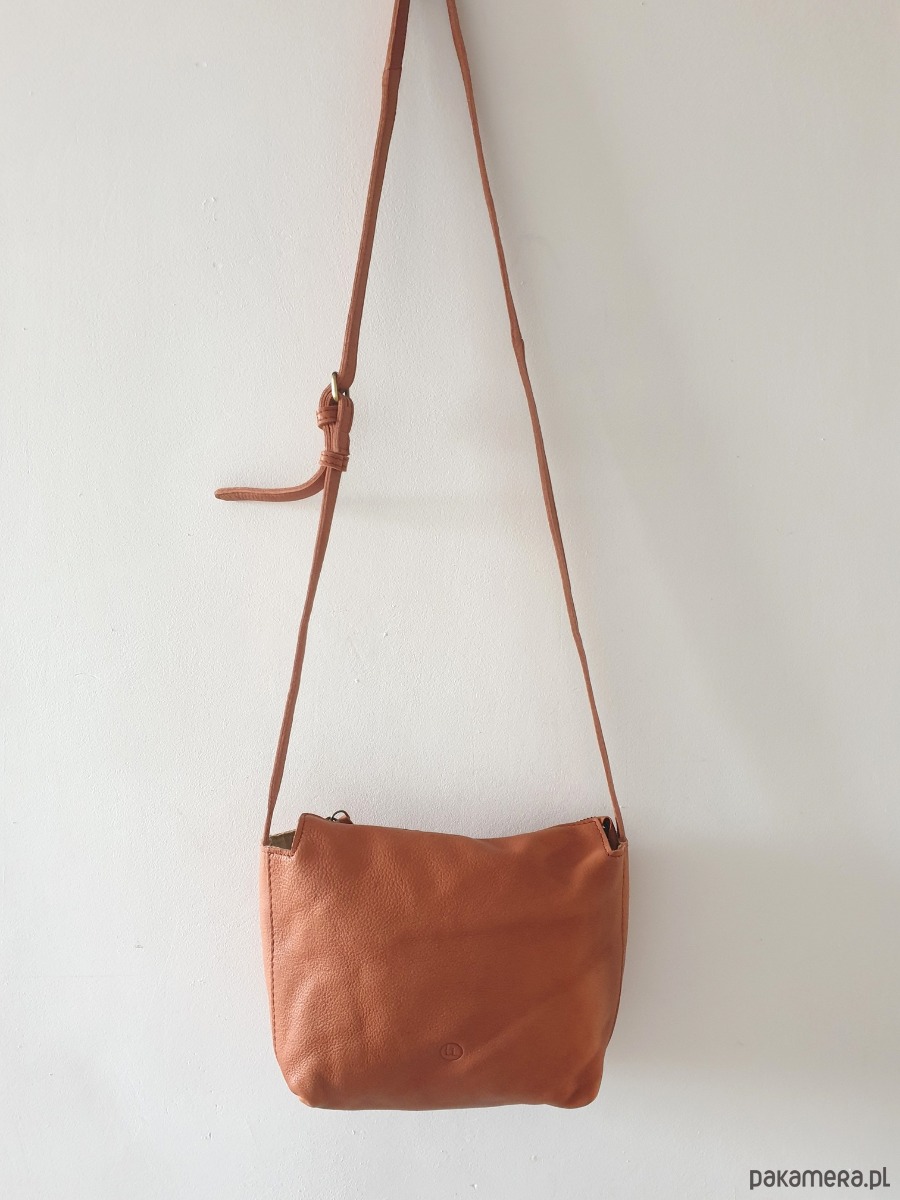 Torebka wykonana z miękkiej pranej naturalnej skóry bydlęcej w kolorze camel, oraz bawełnianej podszewki. Torebka ma skórzany regulowany pasek można zakładać na ramię albo przez ramię. Torebka jest zapinana na metalowy zamek, w środku jest kieszonka, jest dość pojemna.