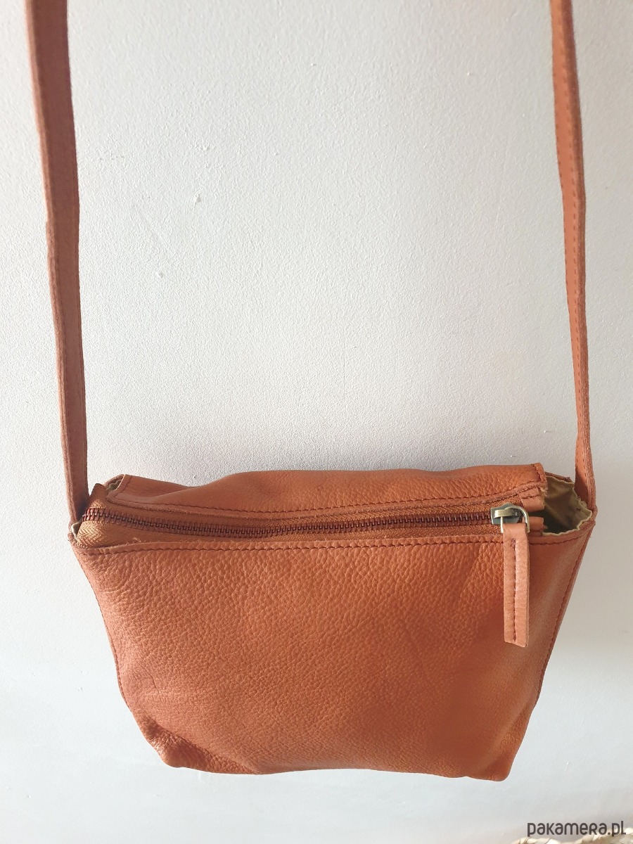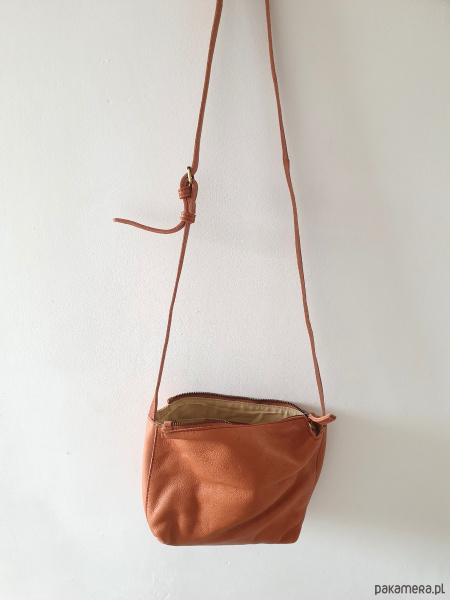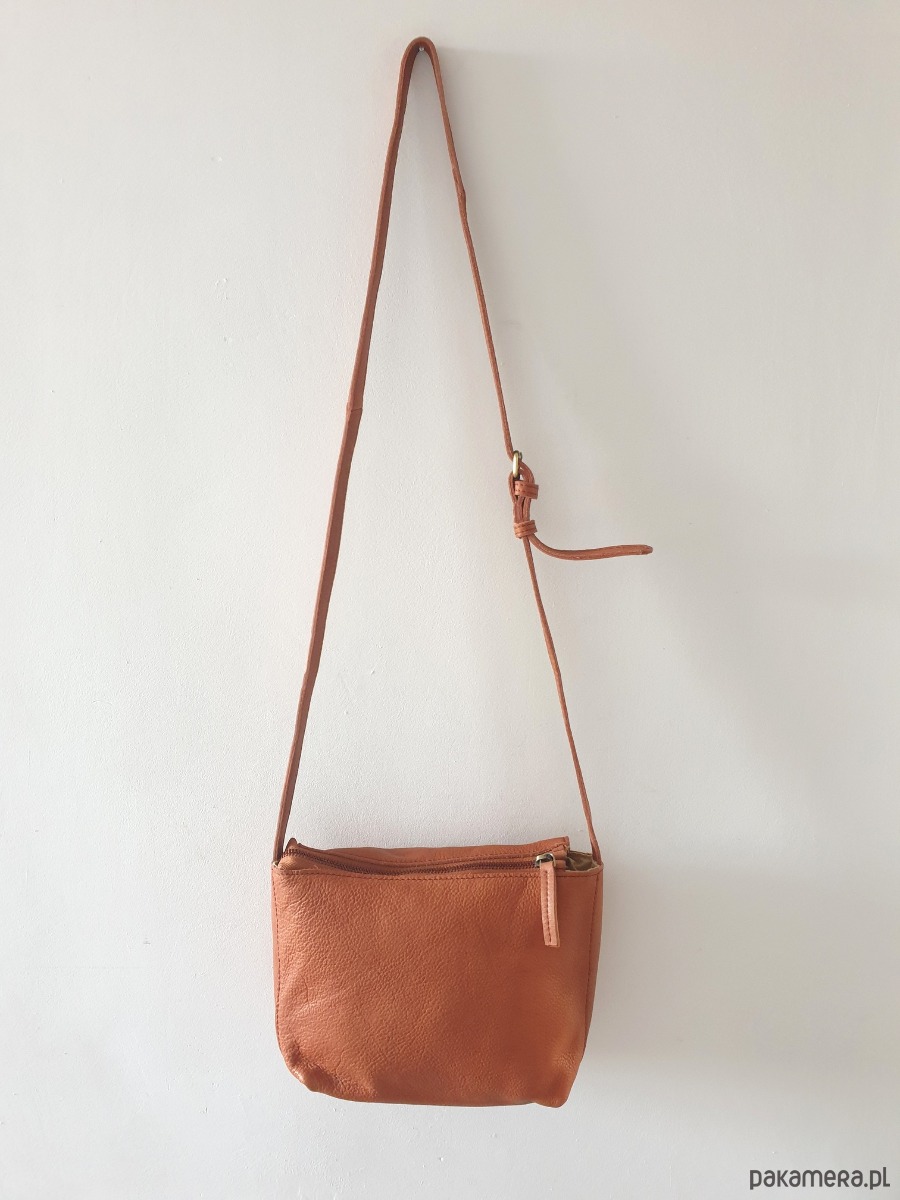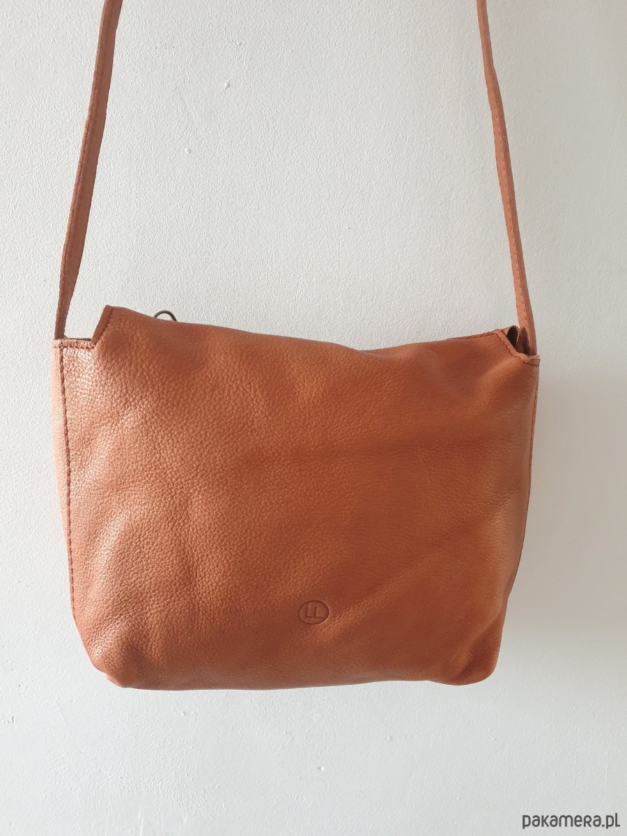 Torebka wykonana z miękkiej pranej naturalnej skóry bydlęcej w kolorze camel, oraz bawełnianej podszewki. Torebka ma skórzany regulowany pasek można zakładać na ramię albo przez ramię. Torebka jest zapinana na metalowy zamek, w środku jest kieszonka, jest dość pojemna.