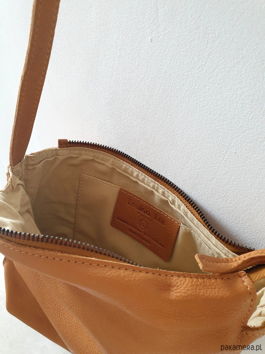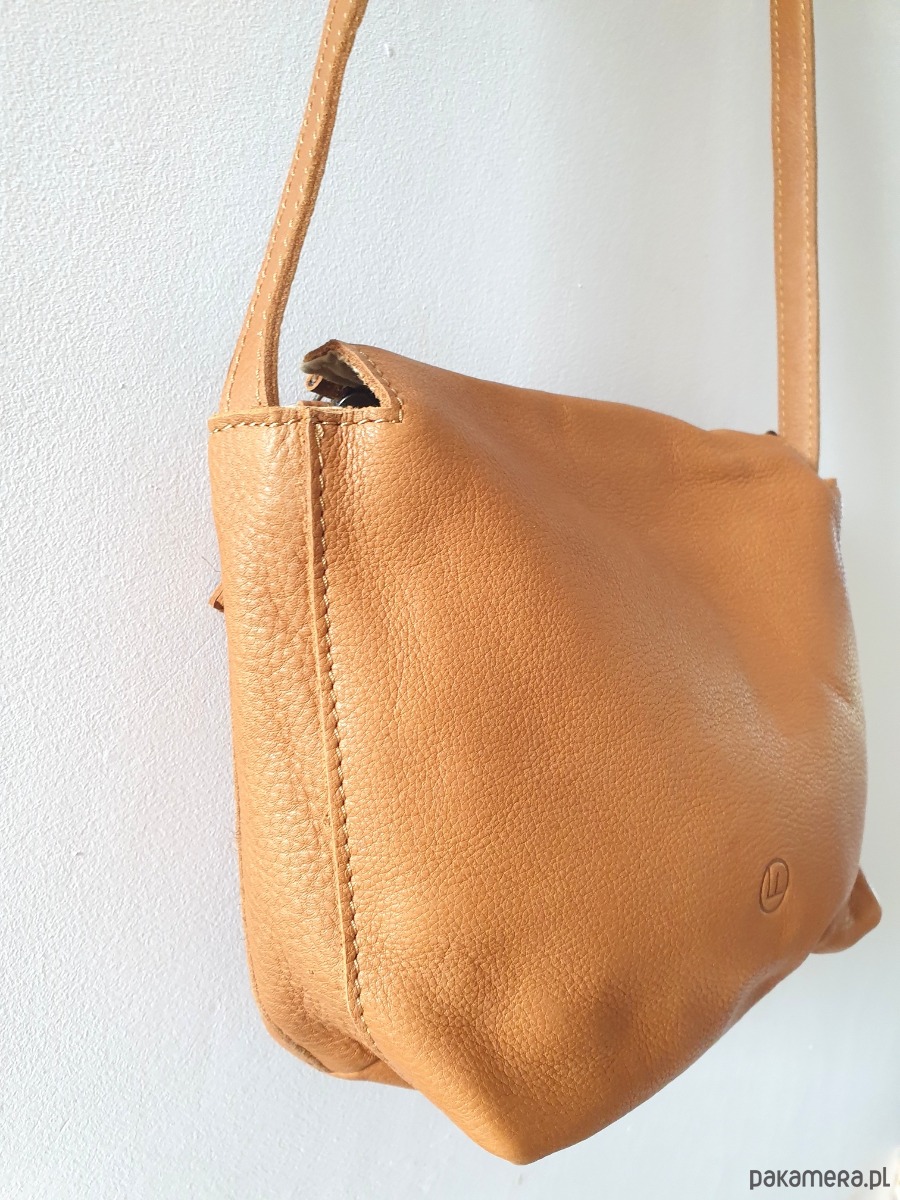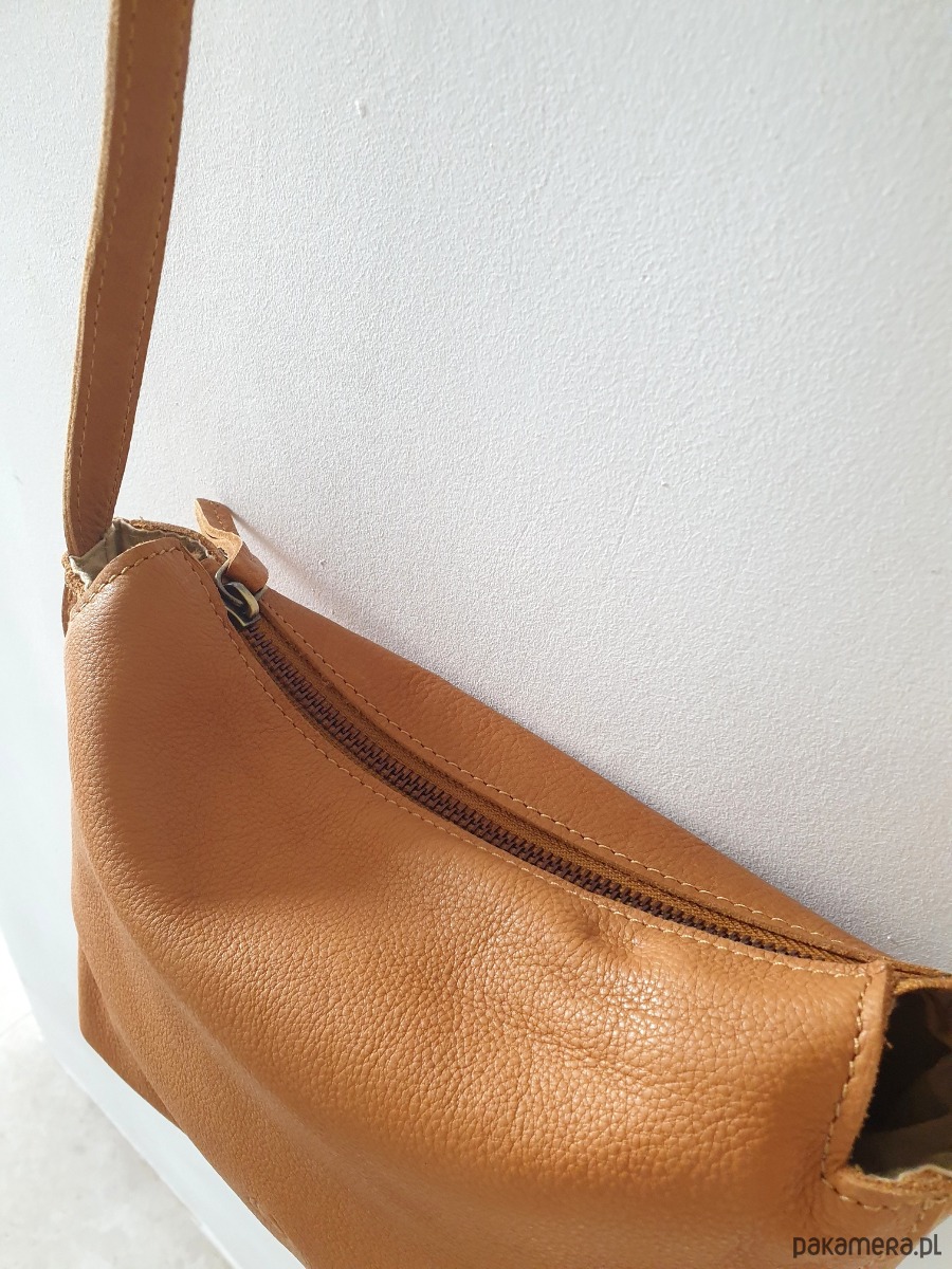 Torebka wykonana z miękkiej naturalnej skóry bydlęcej w kolorze camel (miodowy żółty brąz), oraz bawełnianej podszewki. Torebka ma skórzany regulowany pasek można zakładać na ramię albo przez ramię. Torebka jest zapinana na metalowy zamek, w środku jest kieszonka, jest dość pojemna.