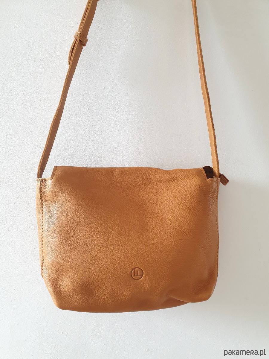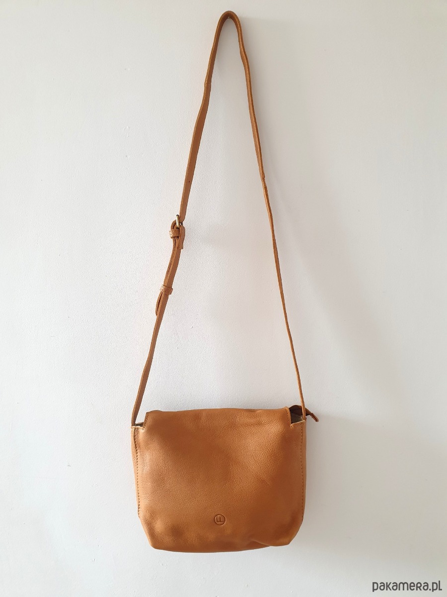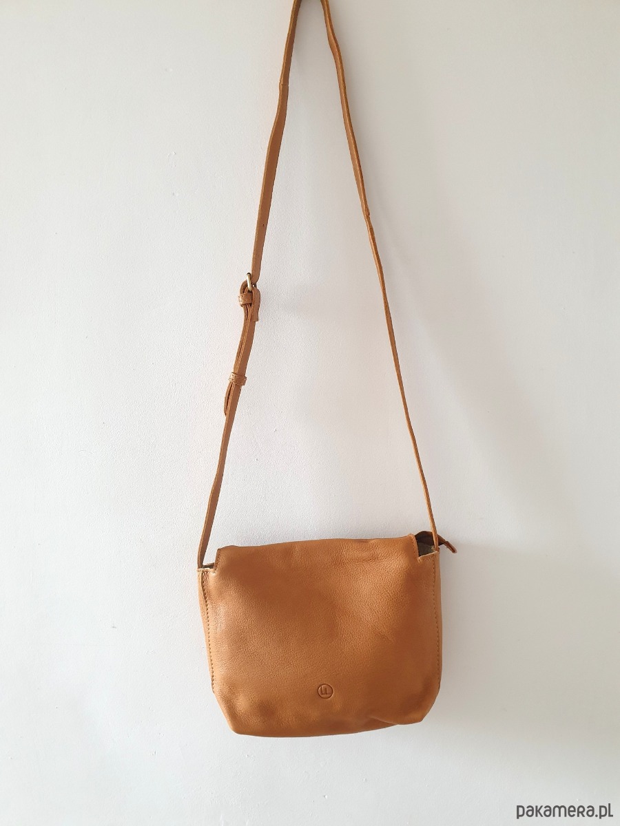 Torebka wykonana z miękkiej naturalnej skóry bydlęcej w kolorze camel (miodowy żółty brąz), oraz bawełnianej podszewki. Torebka ma skórzany regulowany pasek można zakładać na ramię albo przez ramię. Torebka jest zapinana na metalowy zamek, w środku jest kieszonka, jest dość pojemna.