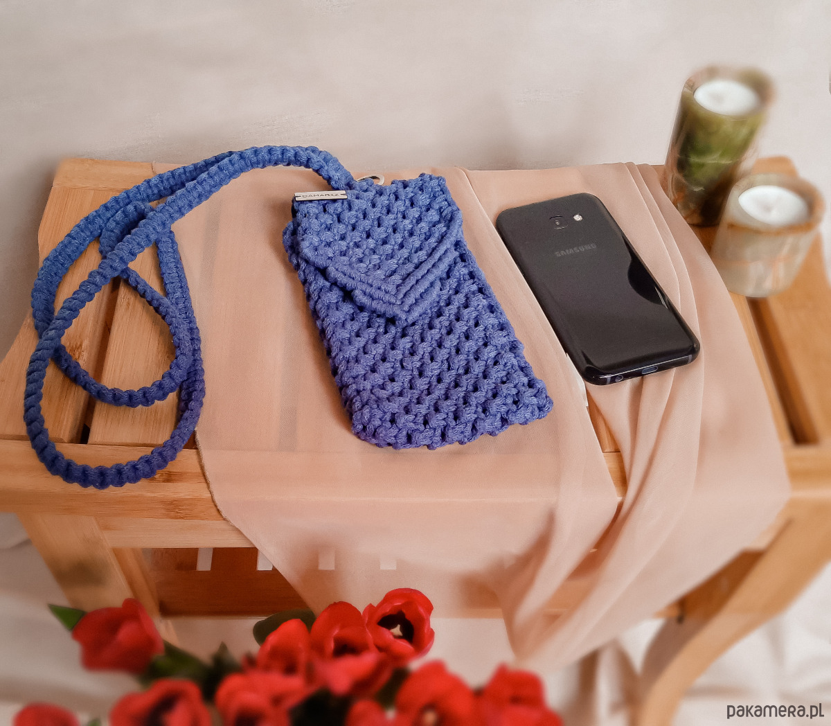 Etui wykonałam ze sznurka bawełnianego z rdzeniem przez co zachowuje swój kształt. Jego wielkość pozwoli zmieścić do środka każdy smartfon.
