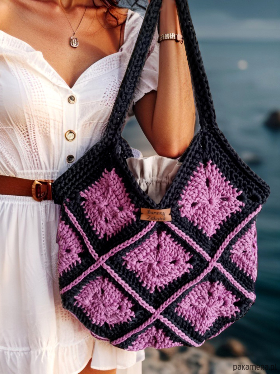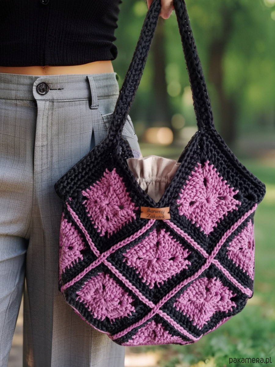 Zmysłowe połączenie brudnego różu i głębokiej czerni tworzy duet, który kradnie spojrzenia. Całość złożona z kultowych kwadratów babuni, które najpierw – niczym puzzle cierpliwości – powstają osobno, by później zszyć się w jedną, zachwycającą formę.