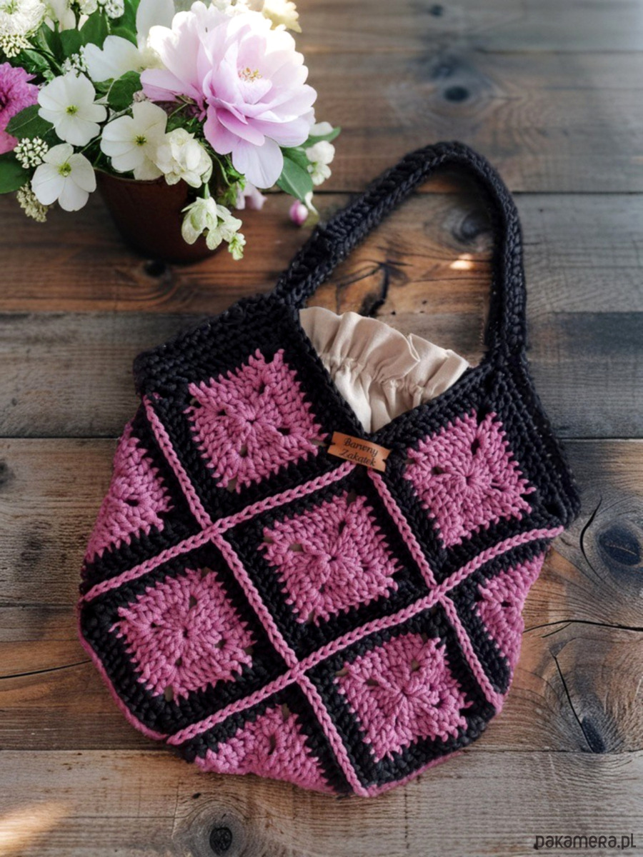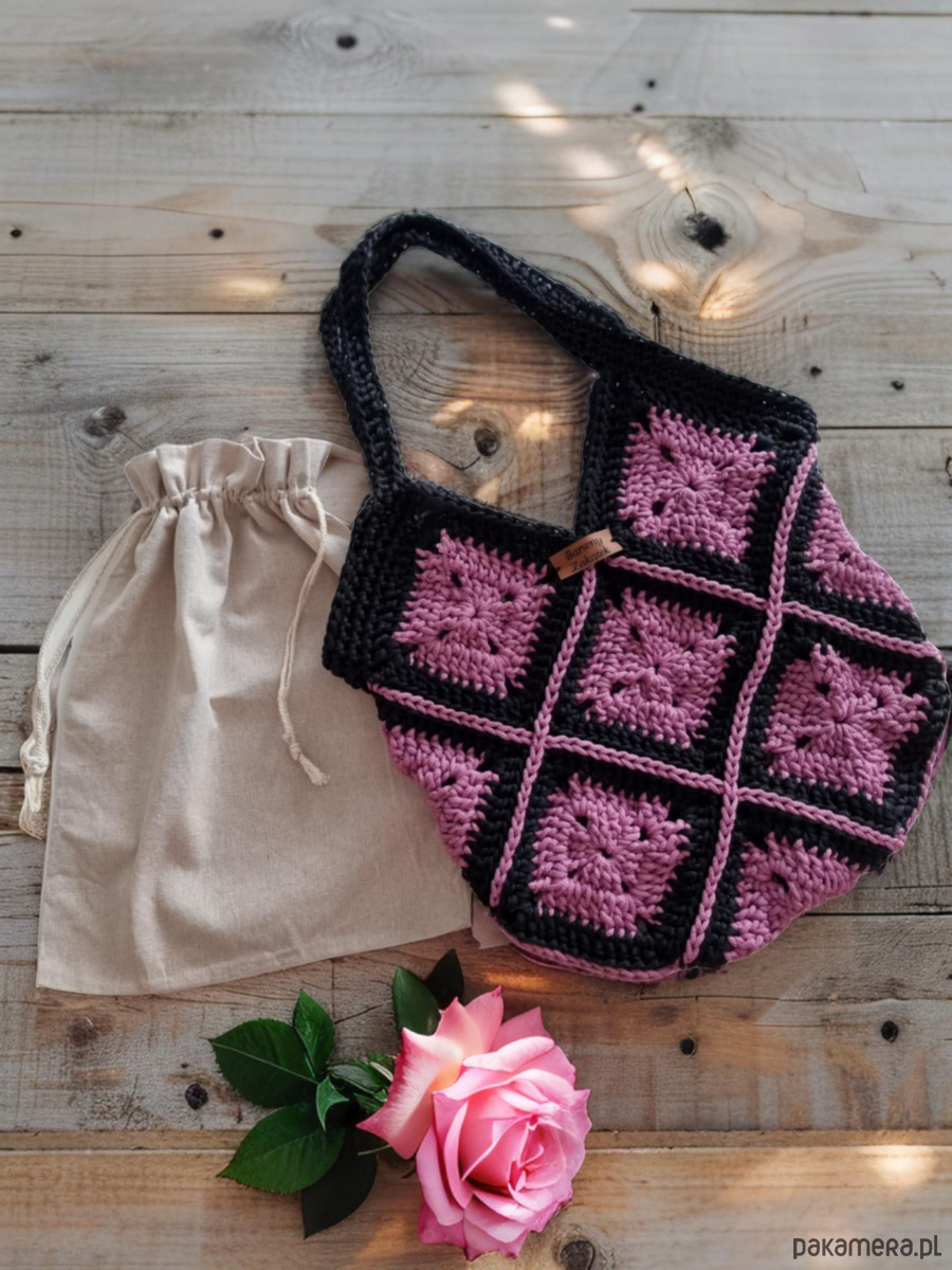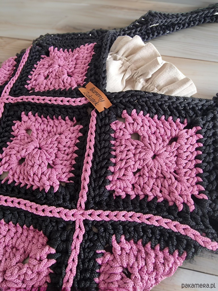 Torebka ze sznurka z kwadratów babuni brudny róż czerń