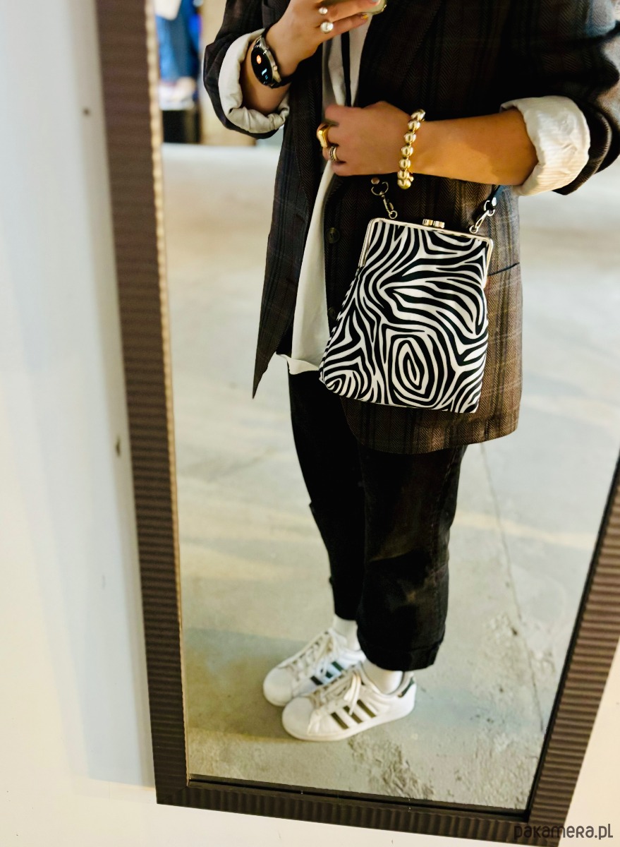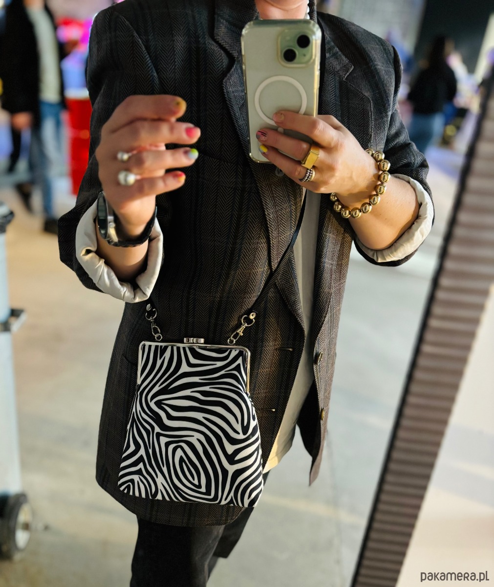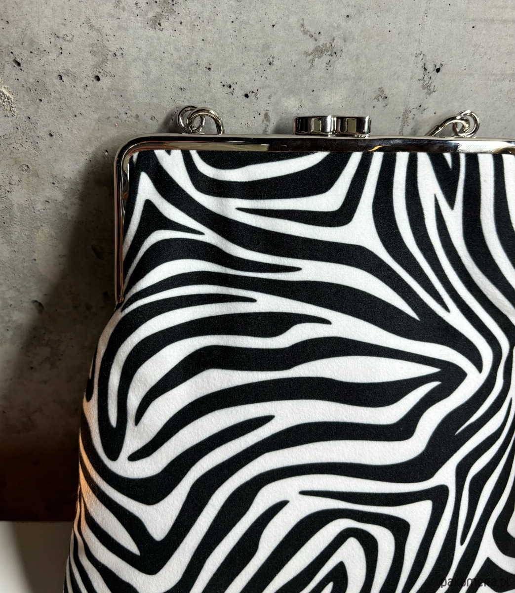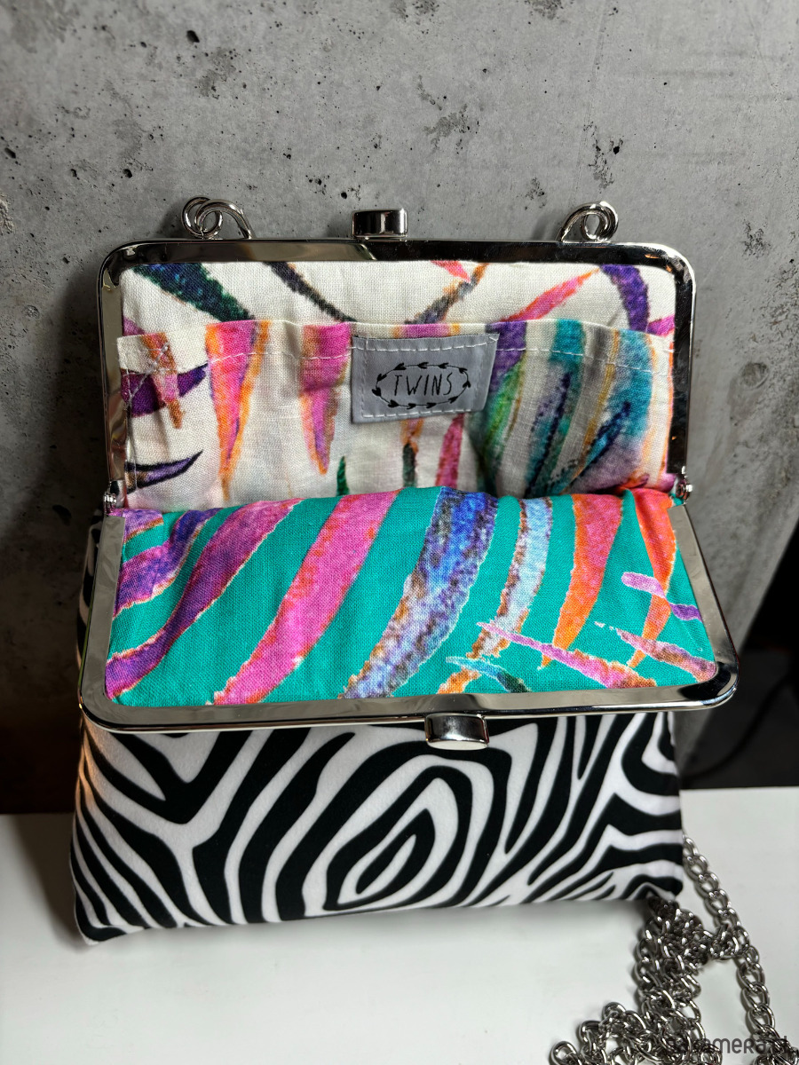 Mała, elegancka torebka zapinana na metalowe, srebrne zapięcie. Wykonana z czarno-bialej, tkaniny. W środku podszewka , torebka jest wykonana z tkaniny obiciowej. Rączka to łańcuszek do zakładania przez głowę lub cienki parciany pasek . Torebka jest usztywniana . Wymiary: 24(długość)x22(szerokość)x5(bok); szerokość zapięcia 16cm .