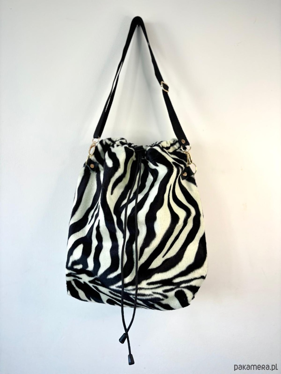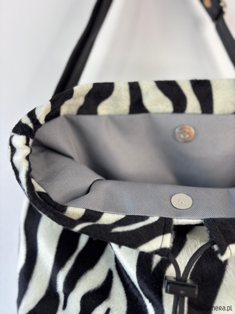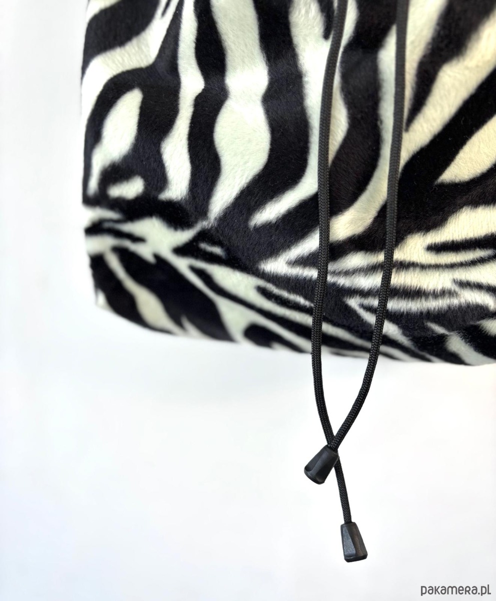 Duża sportowa, torebka zaciągana na czarny sznurek. Wykonana z czarno-białej, tkaniny. Z printem zebry. W środku podszewka , torebka jest wykonana z tkaniny obiciowej. Rączka to regulowany pasek do zakładania przez głowę. Torebka jest usztywniana .