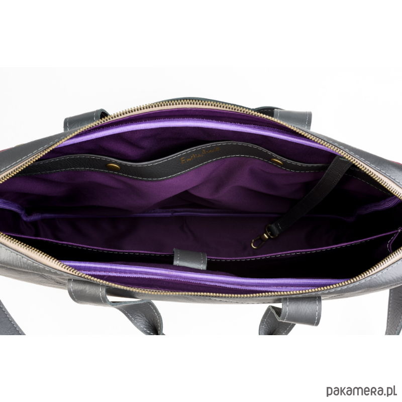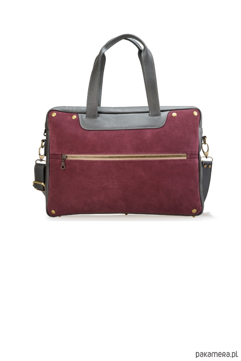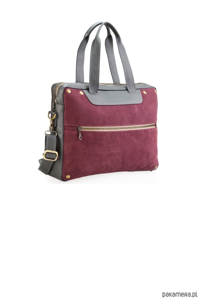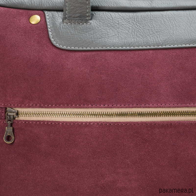 Torbka uszyta z dwóch rodzajów naturalnej skóry - zamszowy front w śliwkowym kolorze, oraz licowa, odporna na zabrudzenia, szara skóra z której zrobione są pozostałe elementy torby.