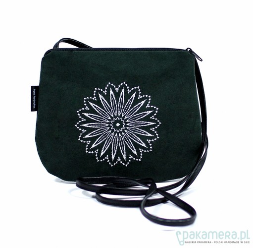 urocza mini torebeczka uszyta z zamszu alcantara w kolorze czarnym, wyszywana maszynowo, zapinana na zamek, w środku podszewka pikowana na ocieplinie, uchwyt z eko skóry WYMIARY: szerokość 17-21cm, wysokość 16cm, dł.ucha 130cm