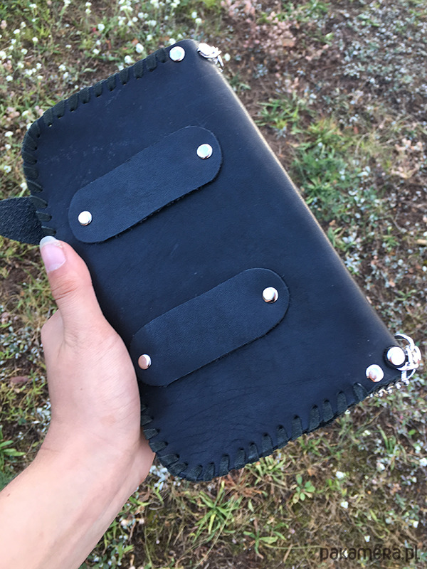Szyta ręcznie rzemieniem skórzanym.