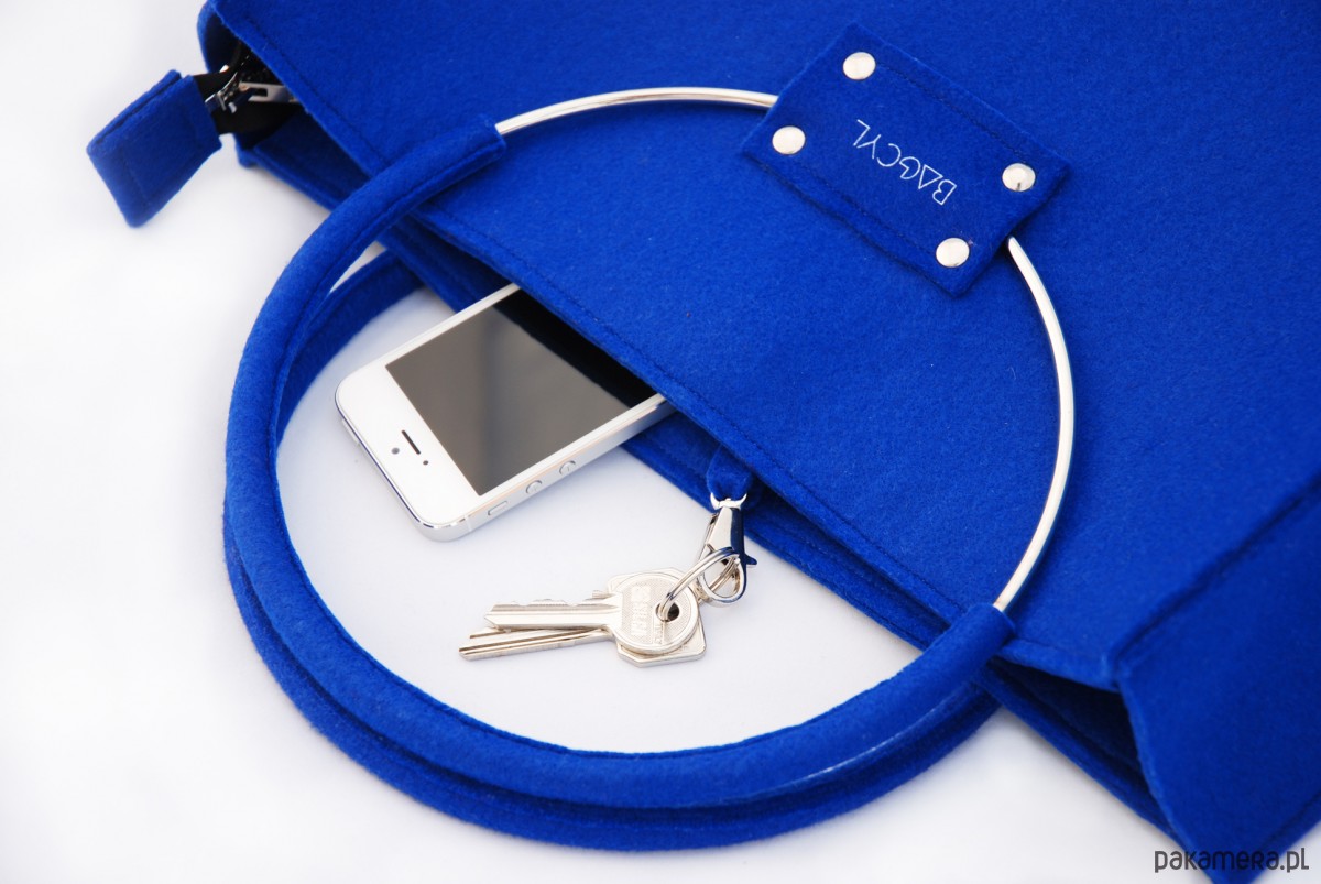 Torebka „Elegantka” jest wykonana z włoskiego filcu o grubości 3 mm. Rączki torby, metalowe koła o średnicy 20 cm, zostały częściowo obszyte filcem. Torebka ma wszyty suwak, dzięki czemu można ją łatwo zamknąć. W środku jest mała kieszonka oraz specjalna zapinka do przypinania kluczy, co ułatwia ich szybkie znalezienie. Aktualnie produkt dostępny jest w kolorze chabrowym, amarantowym, morskim, fioletowym, ciemnym czerwonym, czarnym. Ten model torebki wykonywany jest również z filcu wełnianego, który można zobaczyć w moim butiku. *Kolory torebek mogą się minimalnie różnić od rzeczywistych w zależności od parametrów monitora. Wymiary torby: wysokość torby bez kół: 30 cm, szerokość torby u góry: 35 cm, szerokość torby u podstawy: 37 cm. Materiał: filc poliestrowy.