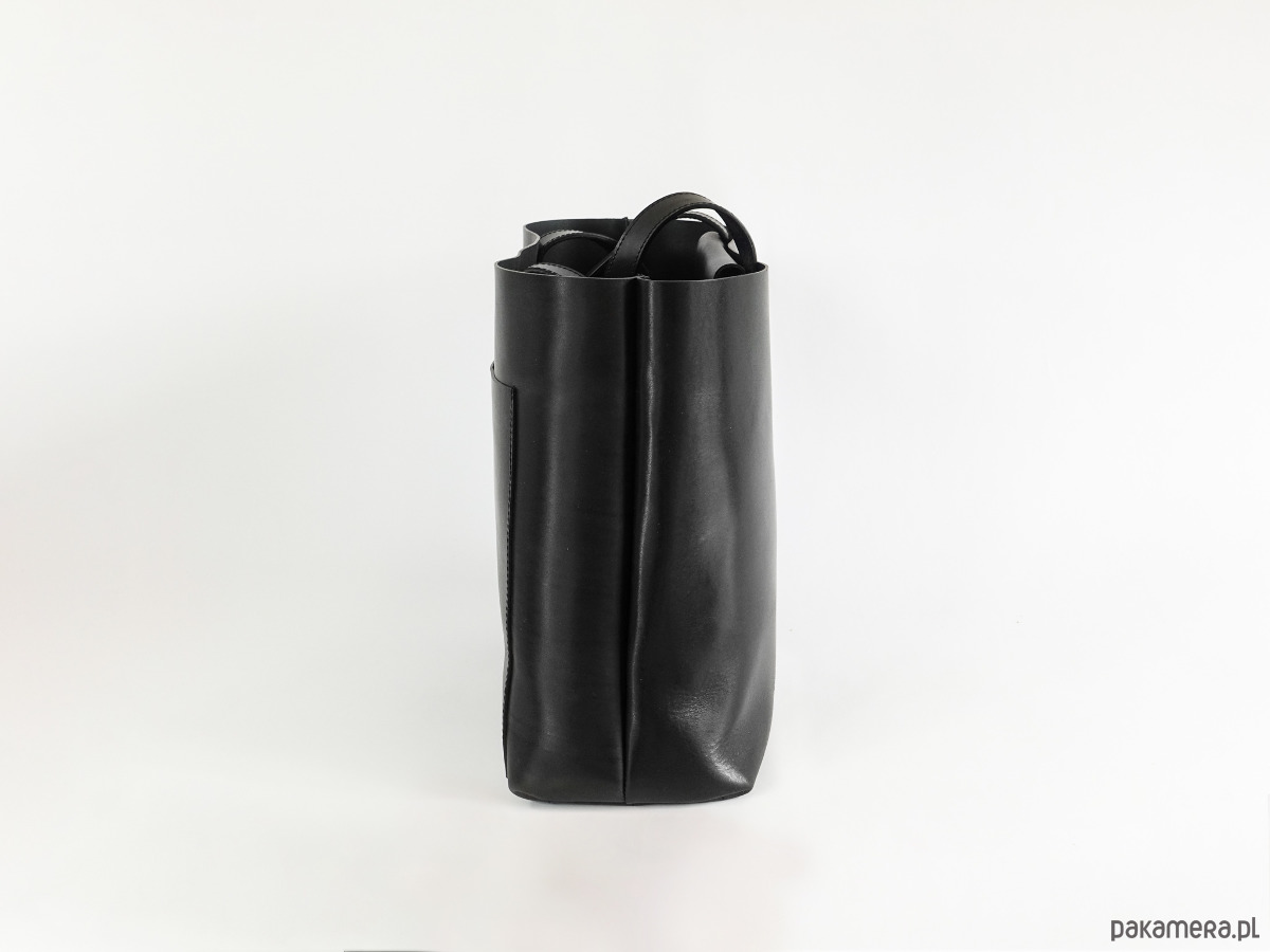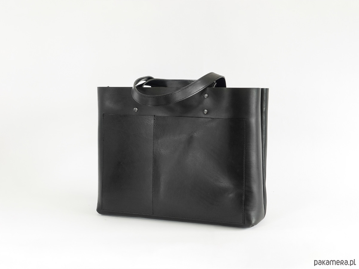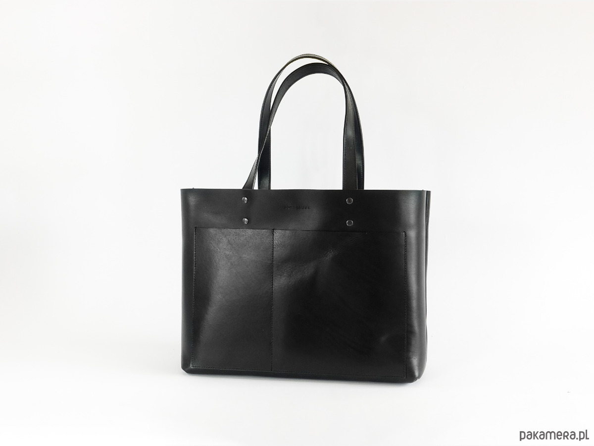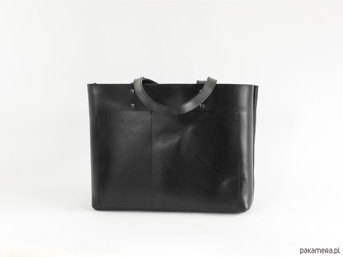 Torba jest wykonana z polskiej, garbowanej roślinnie skóry. Z dużą, pojemną kieszenią z przodu, podzieloną na dwie komory. Jedna spokojnie pomieści książkę o formacie A5, w drugą można schować różne drobiazgi. W środku znajduje się jedna kieszonka z klapką, zapinana na zatrzask, w którą mieści się telefon i portfel.