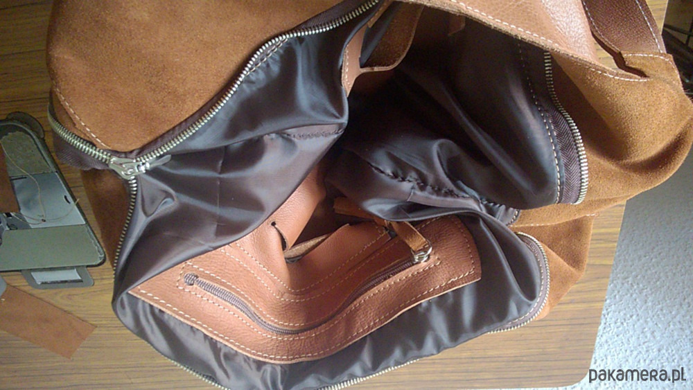 Wewnątrz podszewka. W środku kieszeń zapinana na zamek i dwie kieszonki na telefon.