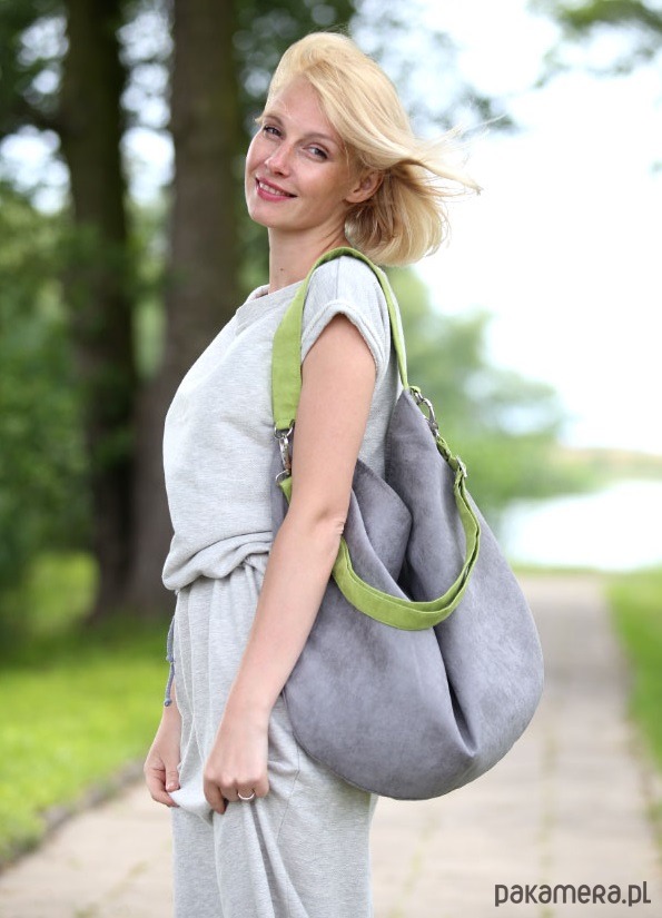 Duża, wygodna, zamszowa torba w kolorze szarym w kształcie łódki do noszenia na ramieniu na krótkiej rączce w kolorze limonkowym, lub na skos na długim regulowanym pasku (jak listonoszka). Doskonale sprawdza się na zakupy, jako torba weekendowa lub plażowa. Idealnie dopełni wiosenne stylizacje, torebka sprawdzi się zarówno przy sukienkach i spodniach.