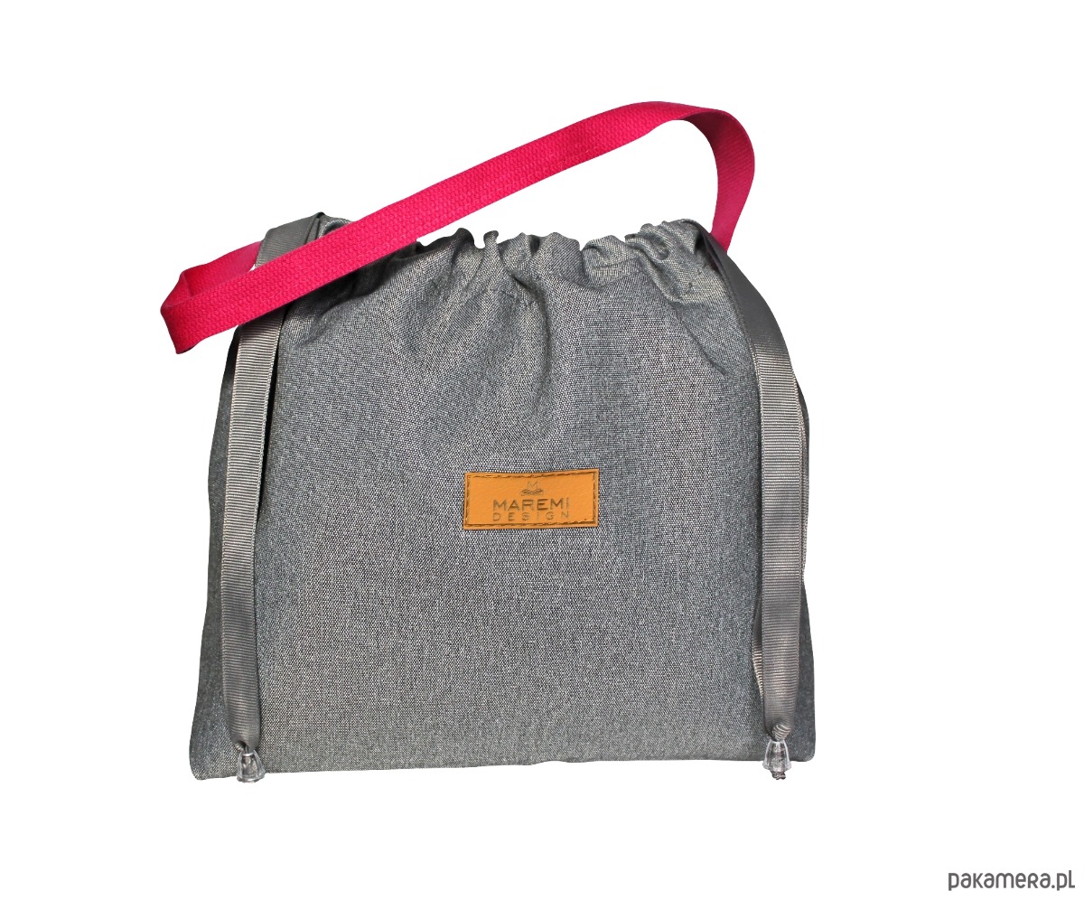 Lunch bag / torebka na drugie śniadanie w kolorze szarym z różową rączką. Jest niezwykle pojemna i lekka. Wykonana z materiału wodoodpornego, dodatkowo posiada usztywniane dno. Krótka rączka wykonana z bawełnianej taśmy parcianej umożliwia noszenie torby w dłoni lub w zgięciu łokcia. Zamykana poprzez ściągniecie satynowymi tasiemkami, zakończone estetycznymi końcówkami.