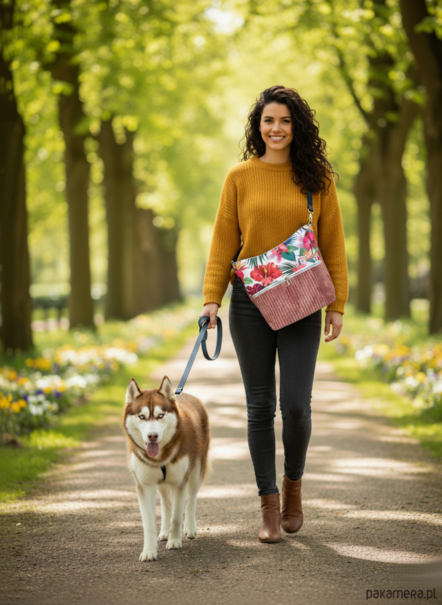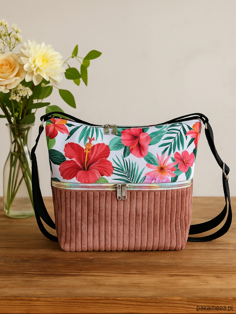 Kobiecy design – góra przodu wykonana z wodoodpornej tkaniny w zachwycający kwiatowy wzór, który od razu przyciąga wzrok. Tył i dół torebki uszyte są z miękkiego sztruksu w kolorze brudnego różu, który dodaje całości subtelnego uroku.