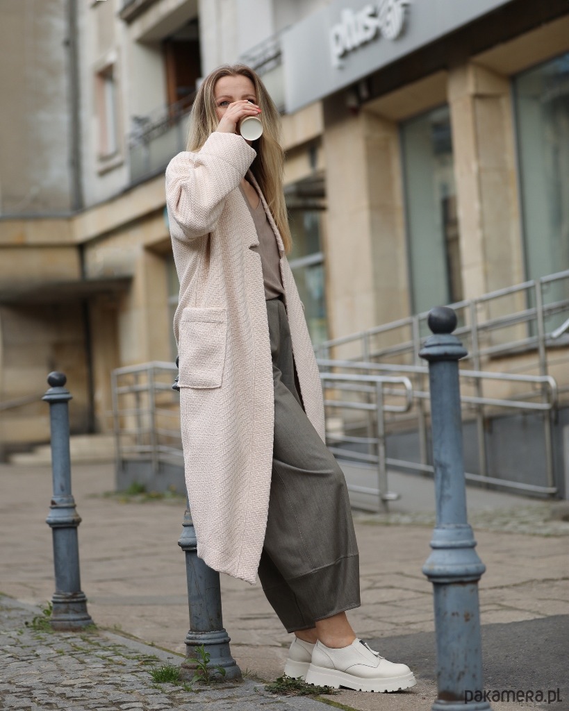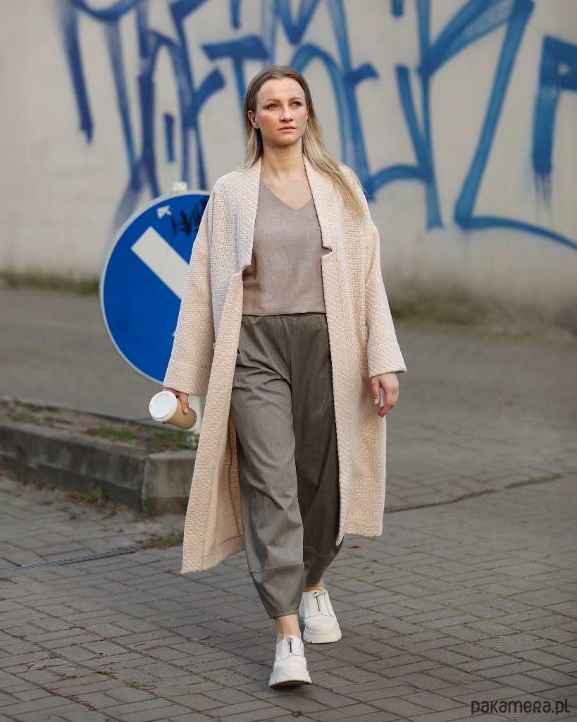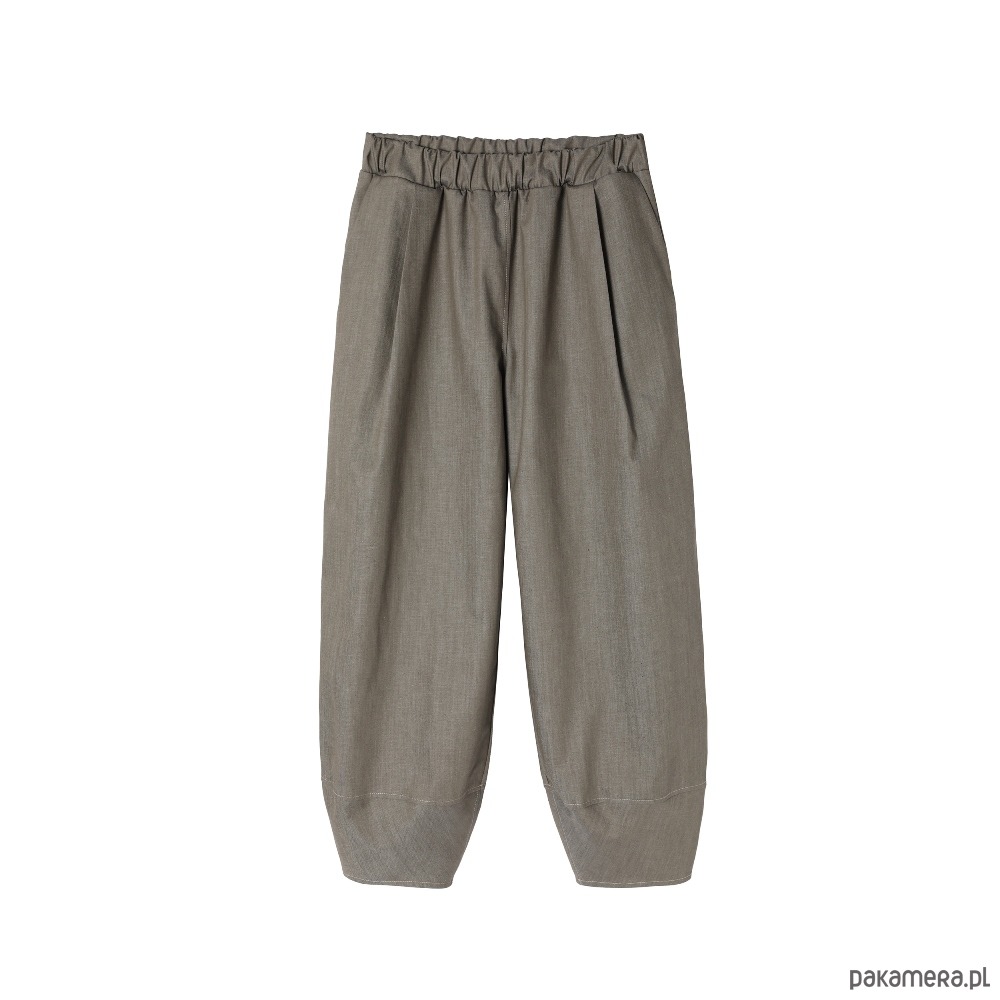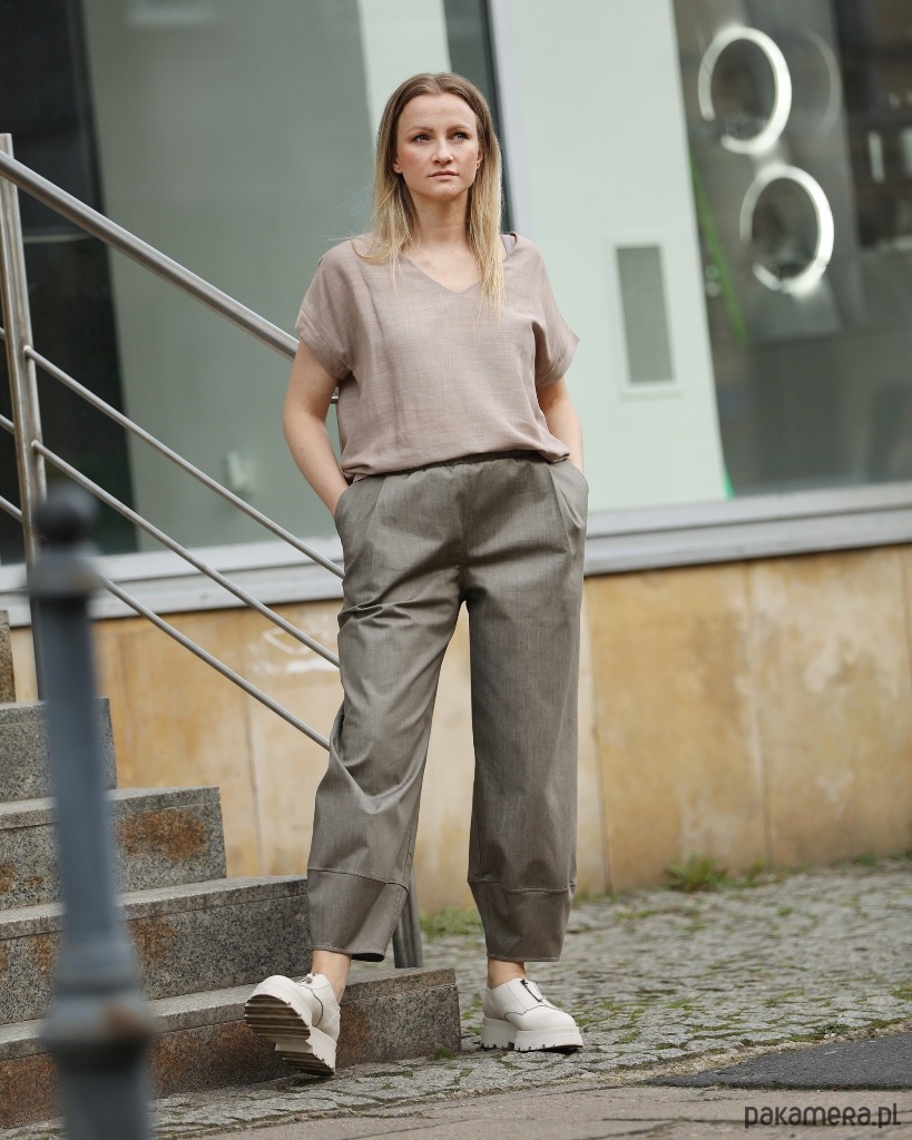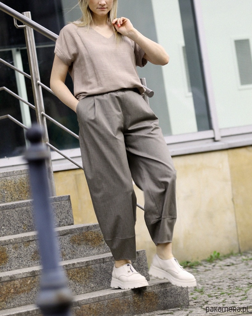 Przód spodni urozmaicają symetrycznie rozmieszczone szerokie zaszewki. Po bokach dwie cięte kieszenie. Góra wykończona szerokim pasem z wszytą wewnątrz gumą. Dół nogawki wykończony jest ciekawym elementem, zamyka je zwężany kielich. który kończy się tuż nad kostką.