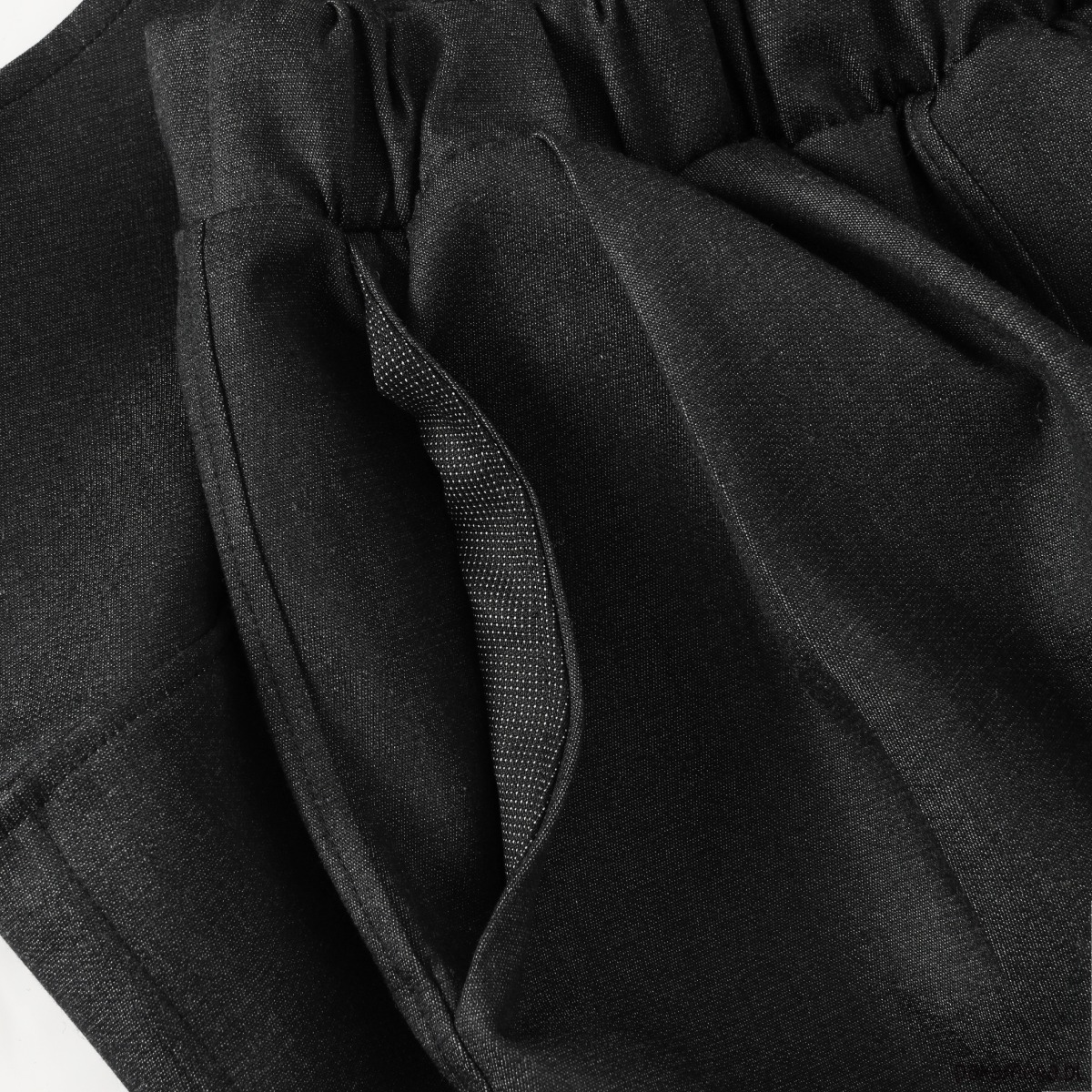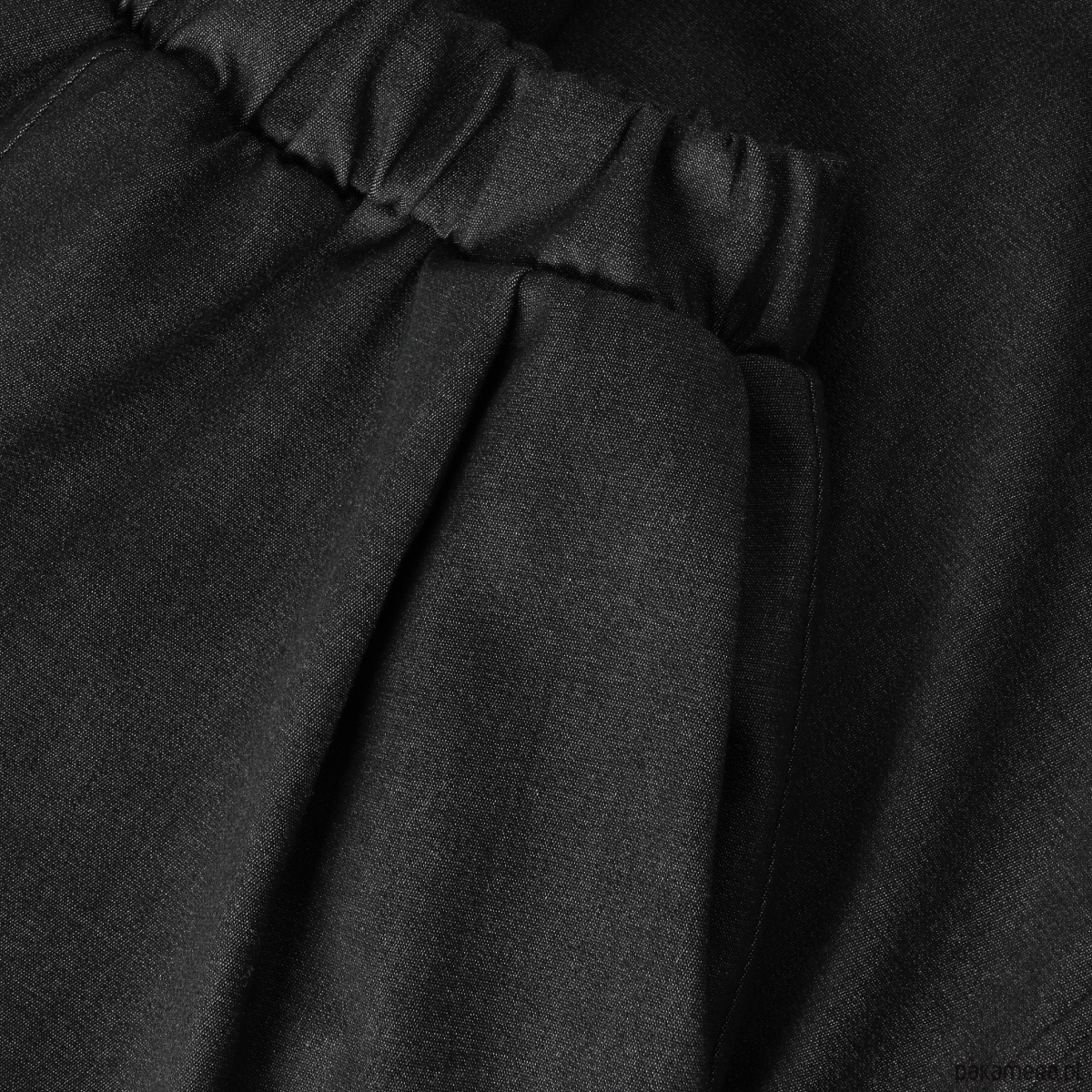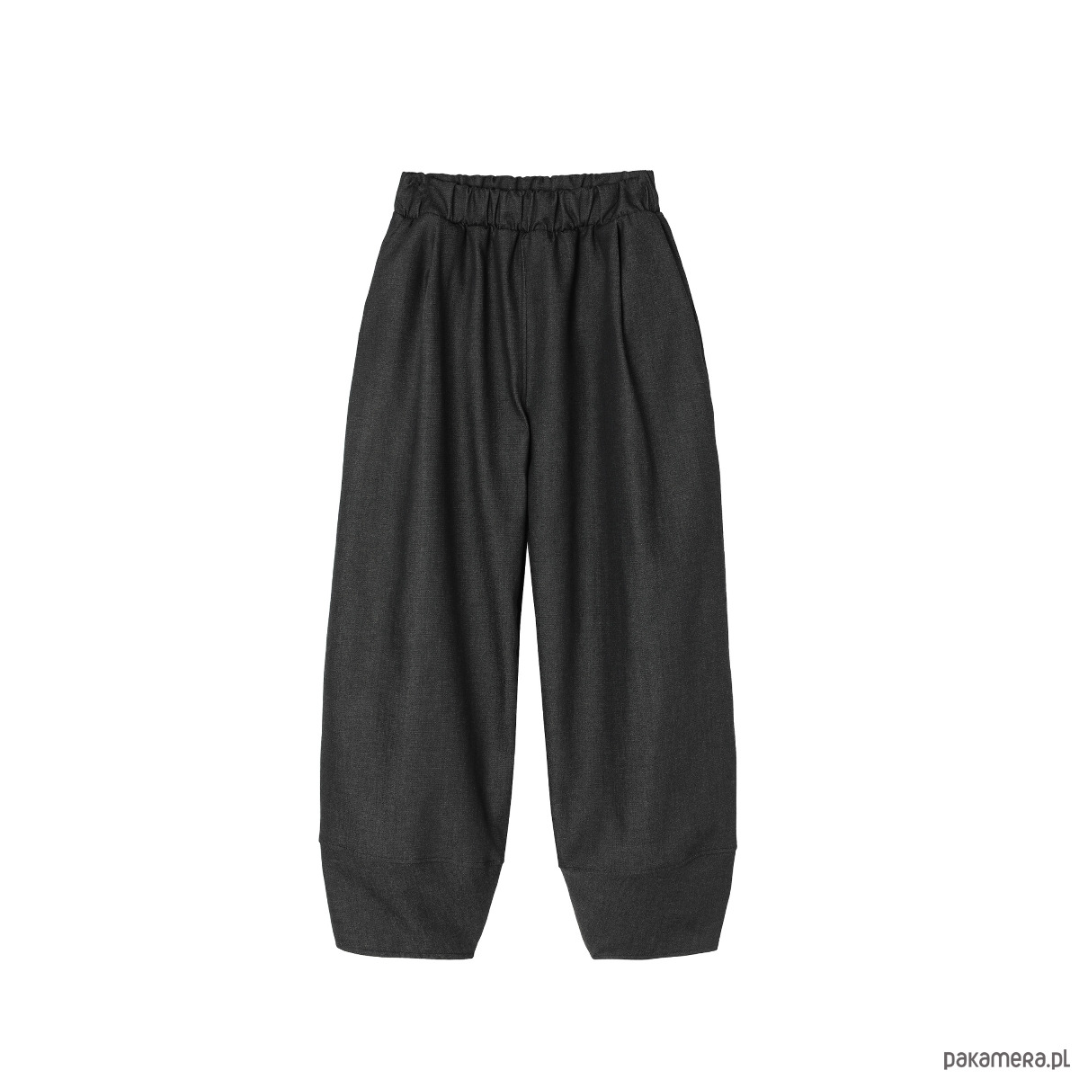 Przód spodni urozmaicają symetrycznie rozmieszczone szerokie zaszewki. Po bokach dwie spore kieszenie. Góra wykończona szerokim pasem z wszytą wewnątrz gumą. Dół nogawki wykończony jest ciekawym elementem, zamyka je zwężany kielich, który kończy się tuż nad kostką.