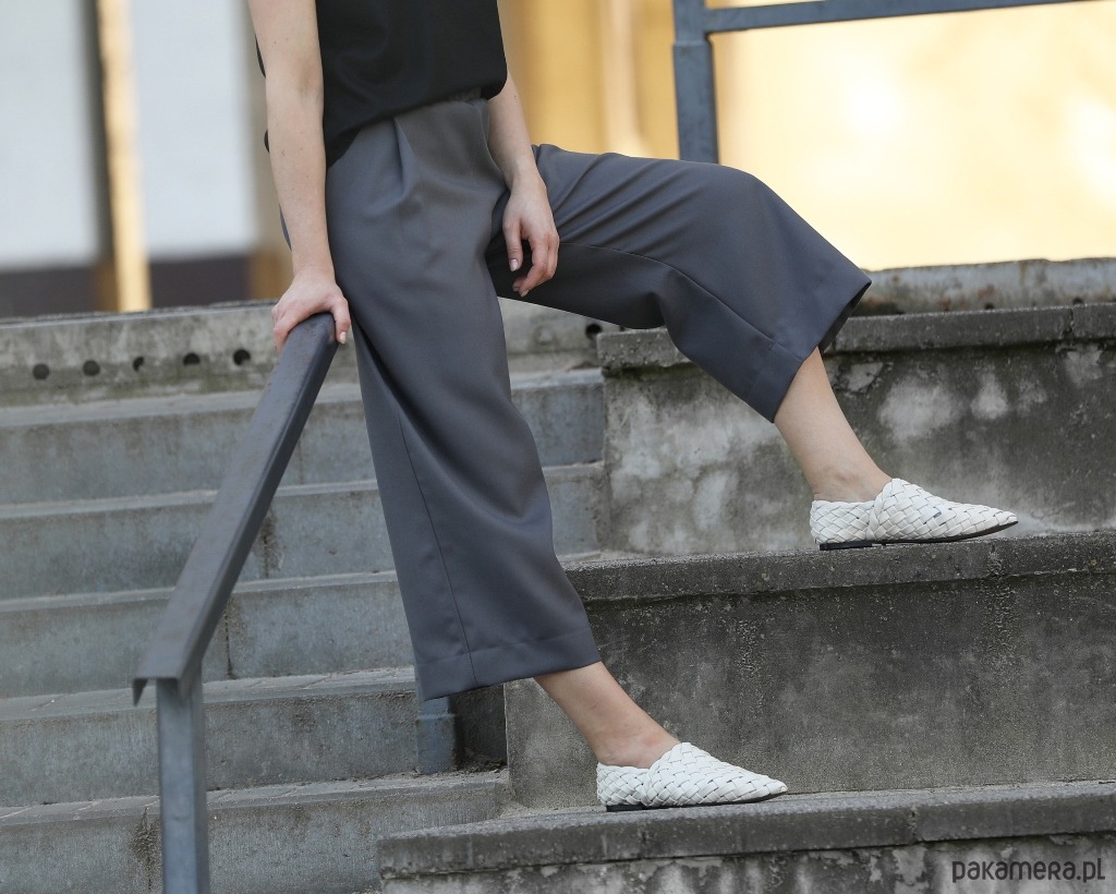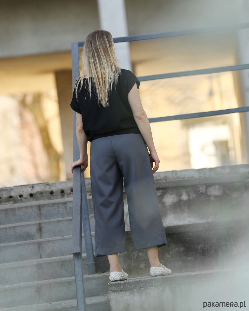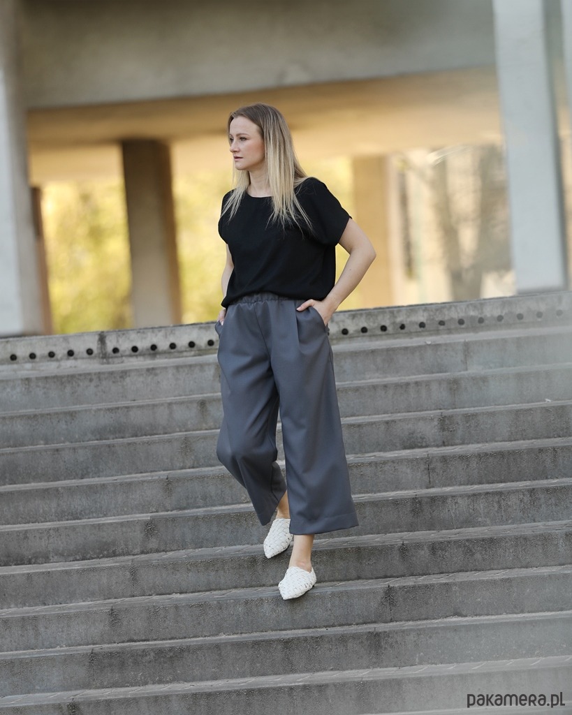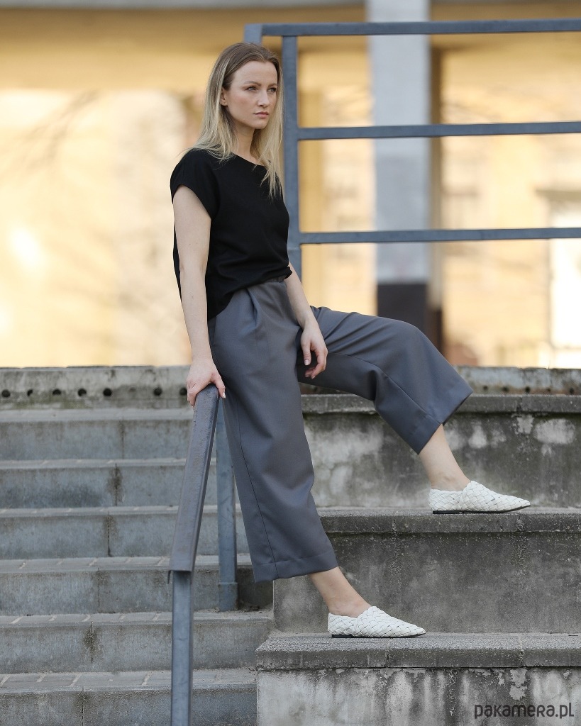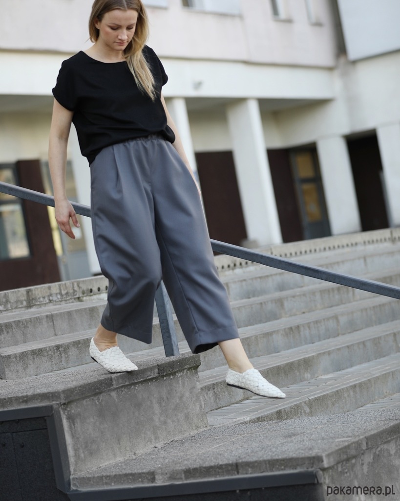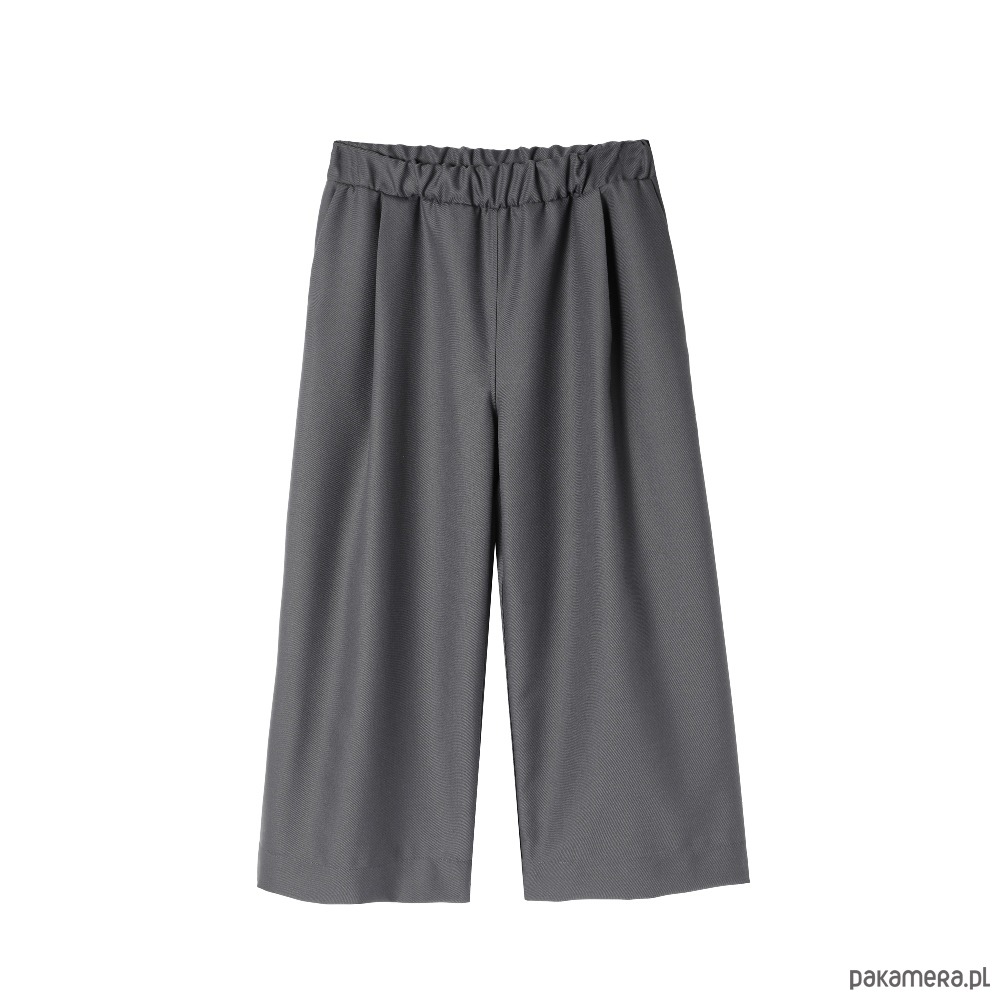 Wyjątkowo wygodne szerokie spodnie typu culotte o długości 7/8. Wykonane z wysokogatunkowej tkaniny wełnianej z elaną. Spodnie świetnie się układają, dzięki dodatkowi elany nie gniotą się i są bardzo przyjemne w użytkowaniu. Tkanina, z której uszyty jest model Torma jest zwarta i stabilna, co powoduje, że spodnie świetnie trzymają formę.