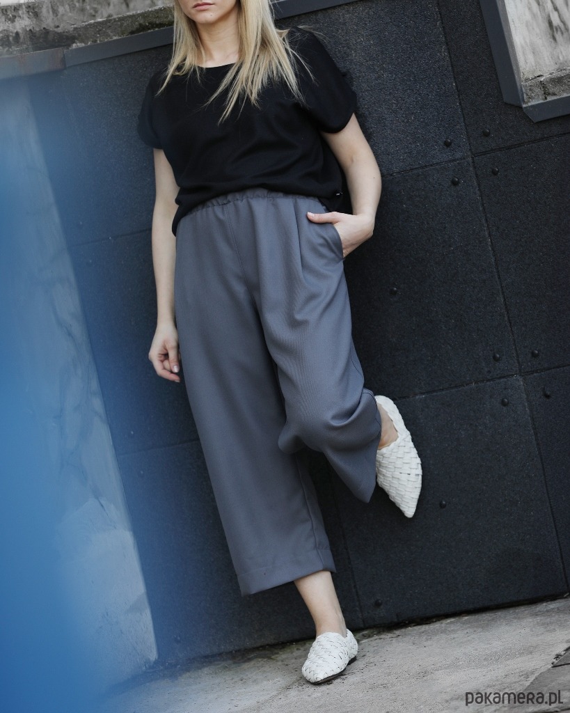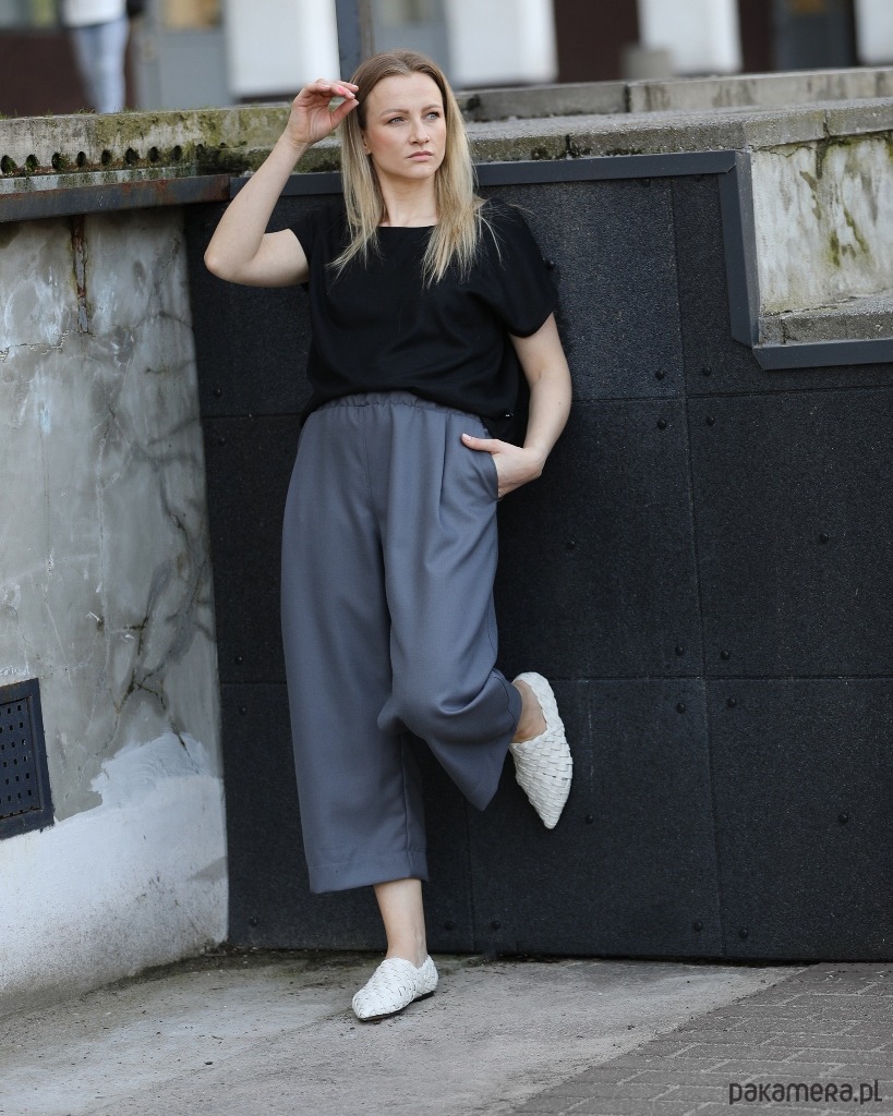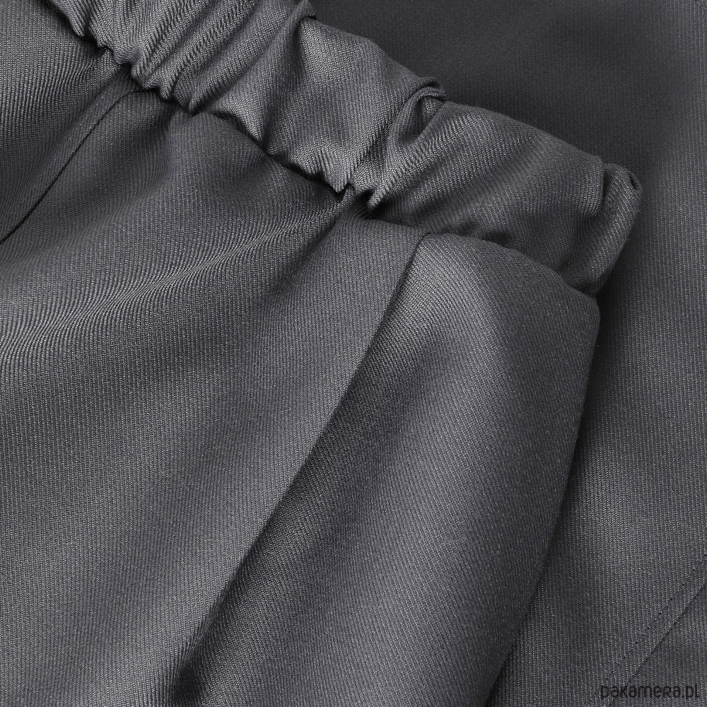 Przód spodni urozmaicają symetrycznie rozmieszczone szerokie zaszewki. Po bokach dwie spore i wygodne kieszenie. Góra wykończona szerokim pasem z wszytą wewnątrz gumą.